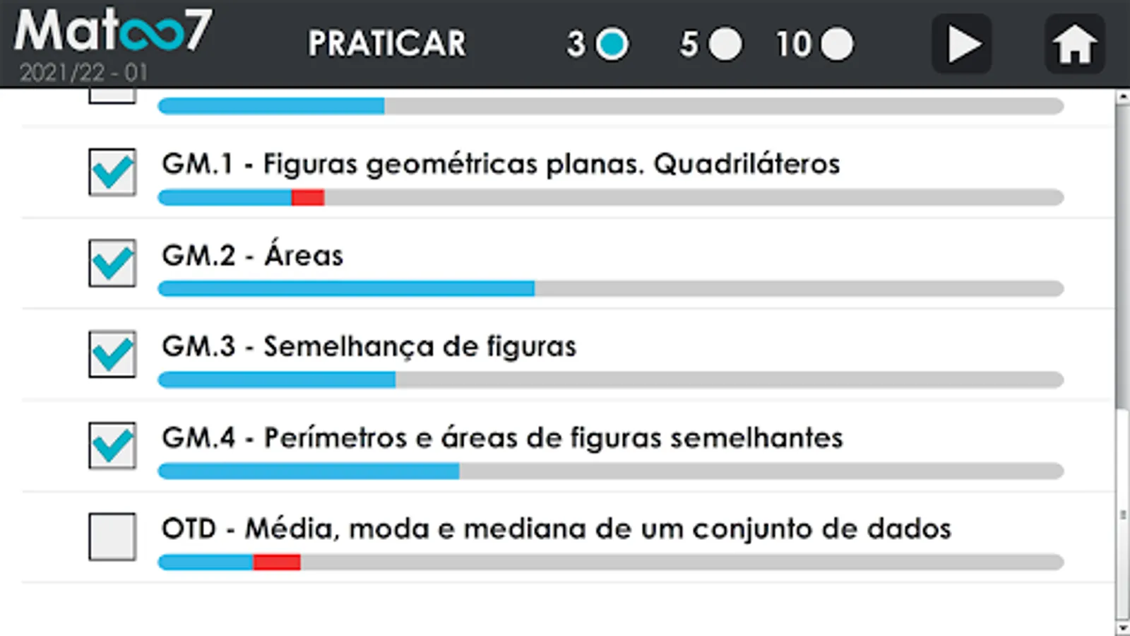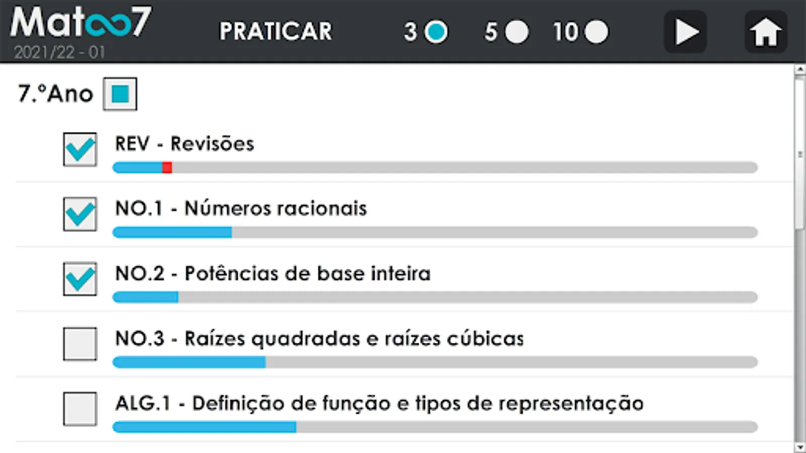 In the PRATICAR section, you will be able to practice solving a wide variety of Mathematics exercises, organized by the following themes: