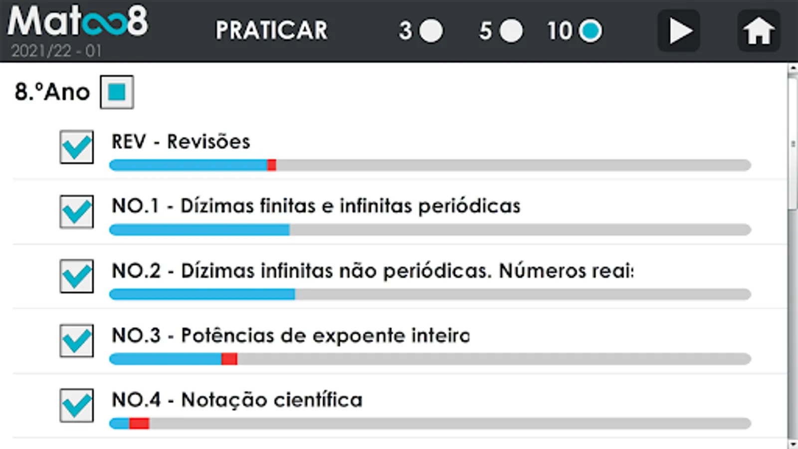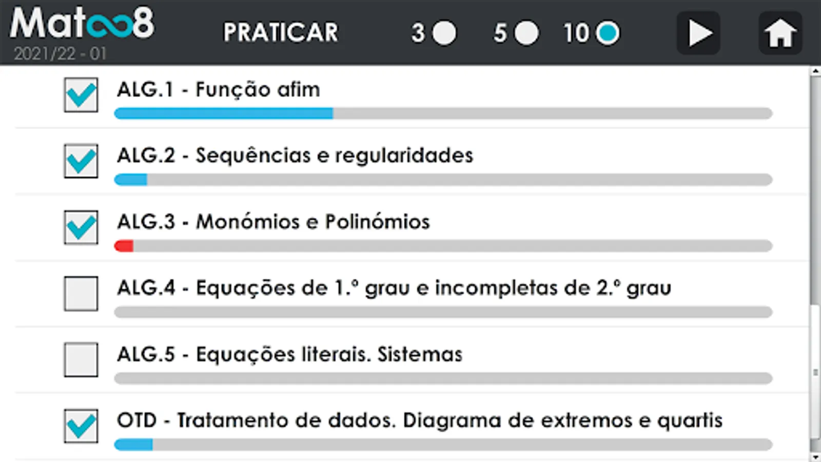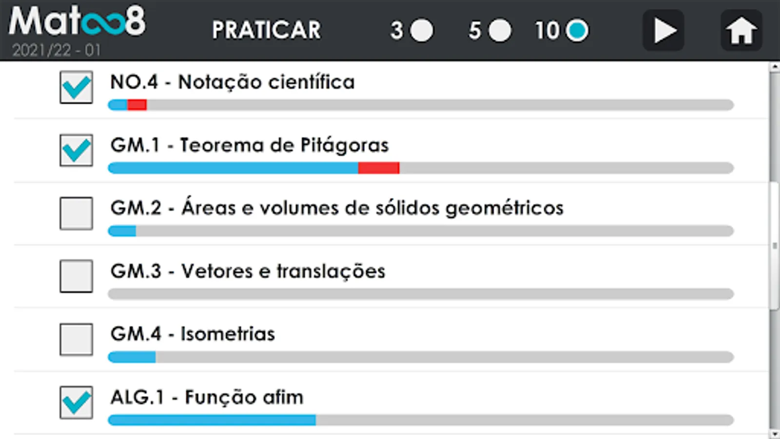 In the PRATICAR section, you will be able to practice solving a wide variety of Mathematics exercises, organized by the following themes: