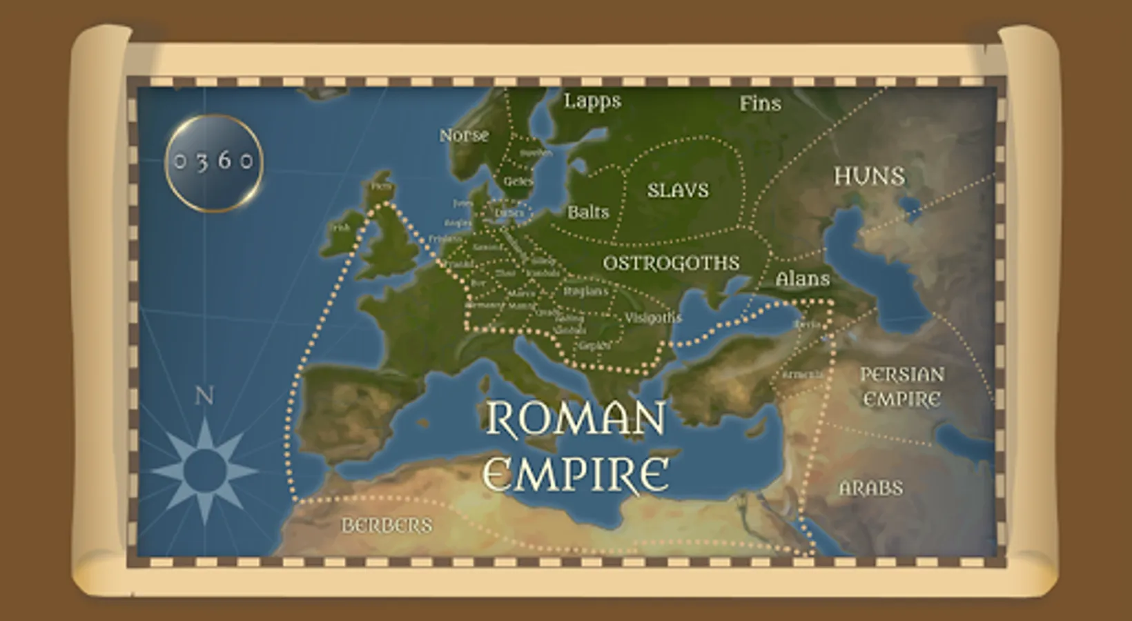 The user can move the map backwards and forwards through history, approximately 40 years at a time. There are 41 maps in total, covering the entire medieval period, from 360 CE through to 1480. The maps display the geographical areas of Europe, North Africa and the Middle East. All place names and included text are in English.