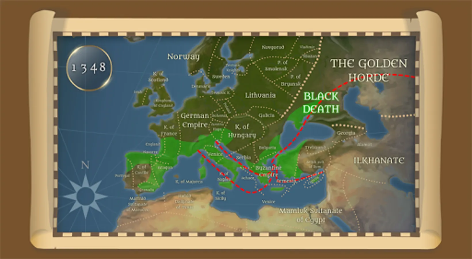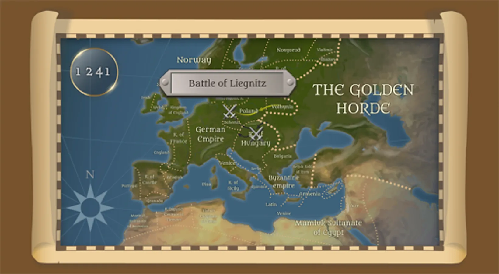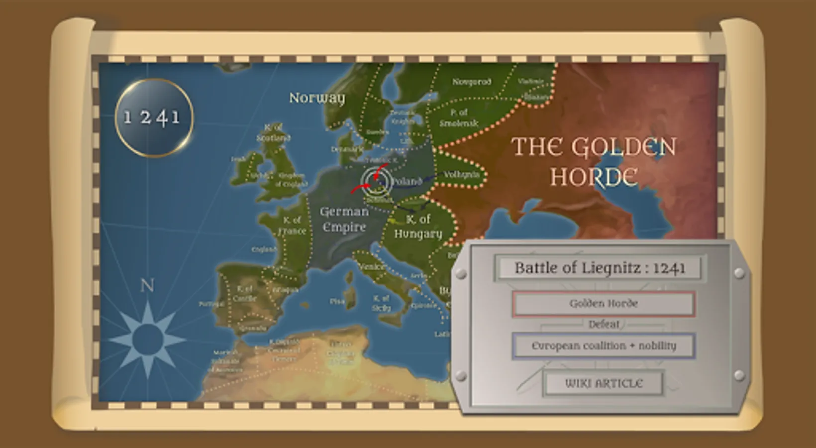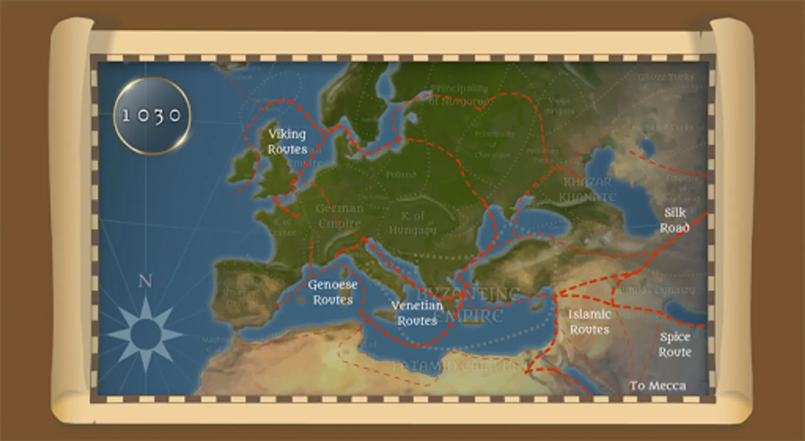 An animated and interactive map of the medieval era, with overlays showing tribes, empires, cities, battles and other aspects of life such as trade.