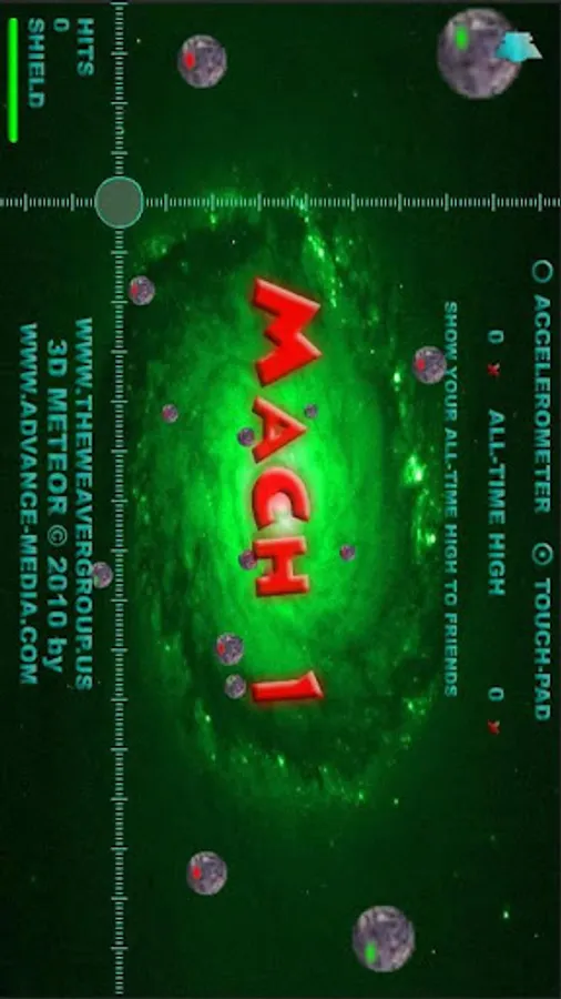 Fly into a meteor shower. Shoot'em up! Crosshairs and in 3D! Your shield weakens with each missed meteor. Play with accelerometer or touch screen/pad. Wide stereo sound. 3 levels. Click 'Mach 123' to play and to set a new accelerometer anchor.