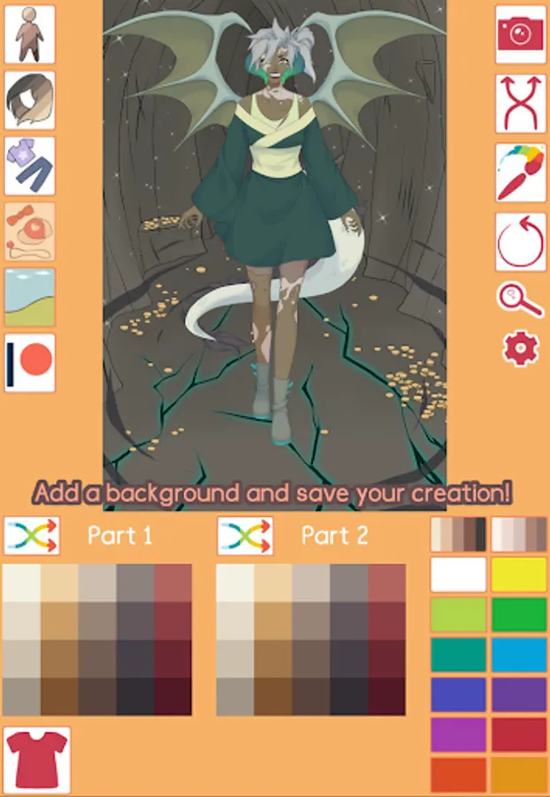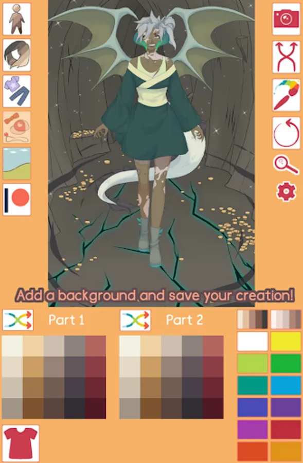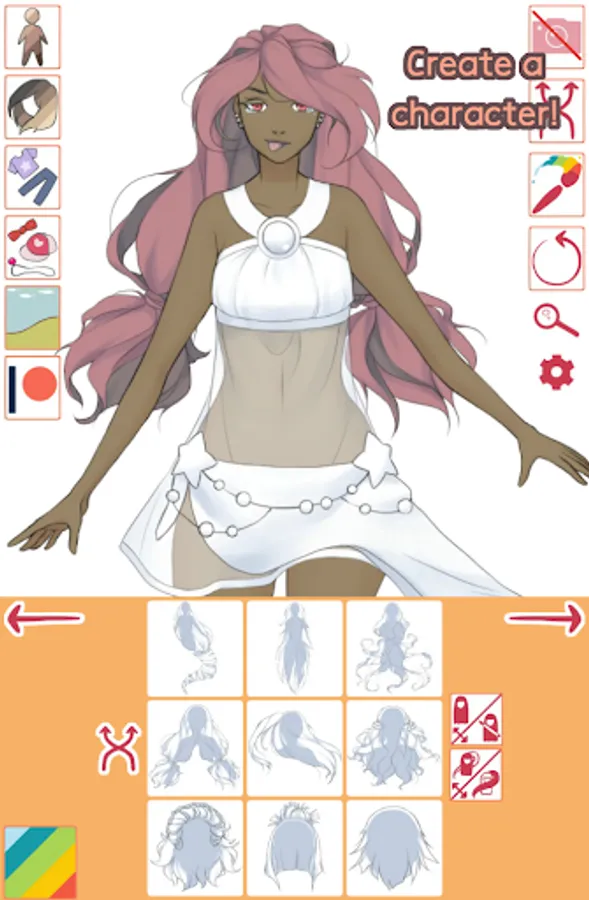 Create characters by picking different body features and hairstyles, dress them up and choose colors! If you need help with inspiration you can use the randomize buttons for both the entire character and individual items. When you're done you can save the creation on your device!