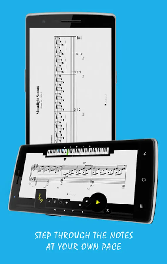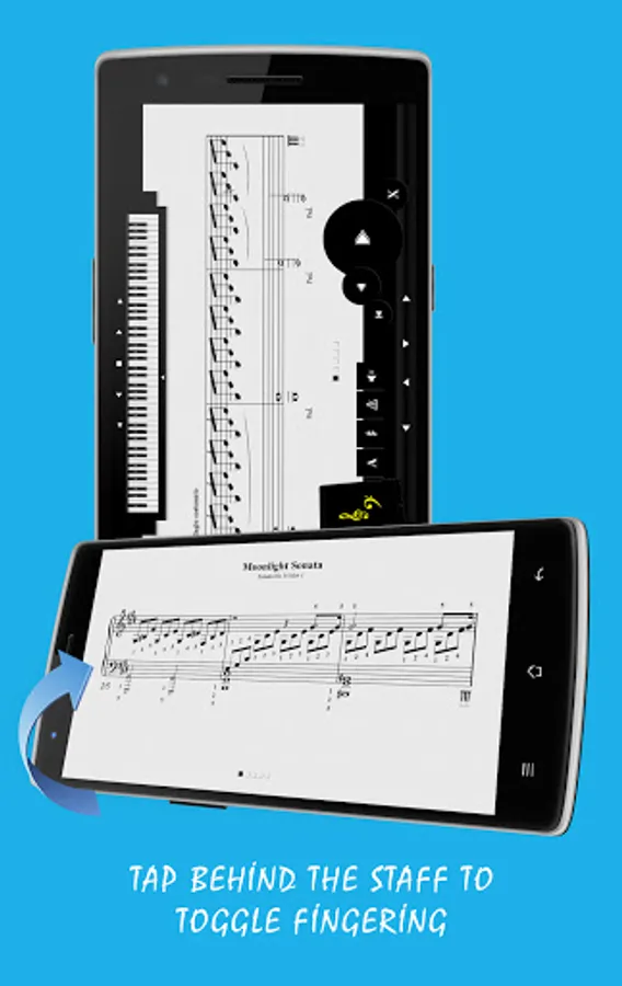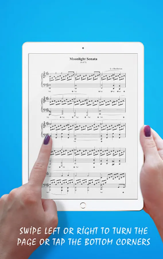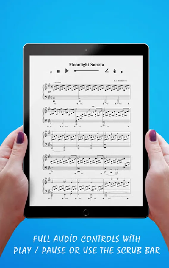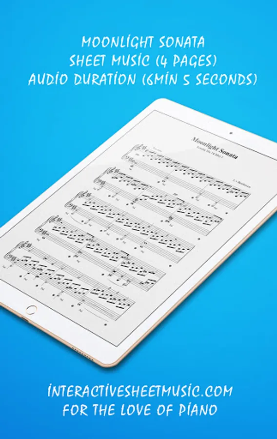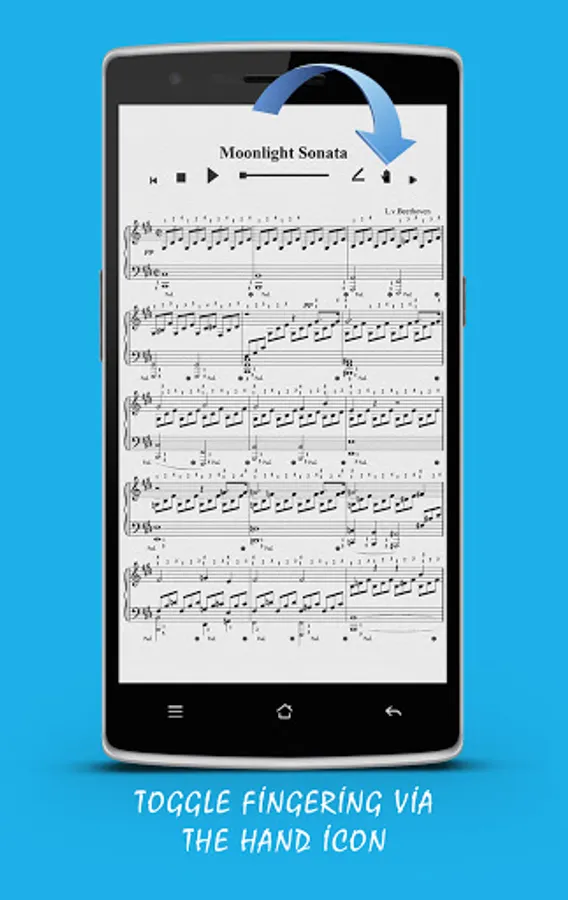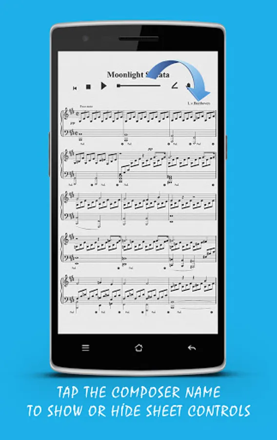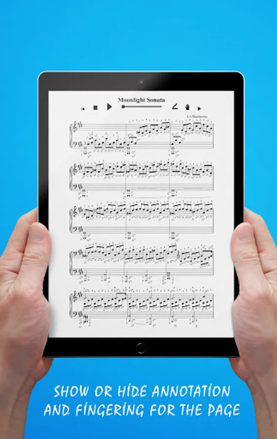 Our Piano Sheet Music App contains interactive features hidden from view upon launch yet quickly accessible when you need them. Tap on the composer name (L.v. Beethoven) to show or hide annotation and fingering or play audio from specific parts of the songbook.