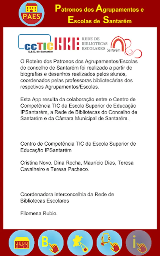 This App is a collaboration between the ICT Competence Center of Higher Education IPSantarém School, the County Library Network of Santarém and the Municipality of Santarém.