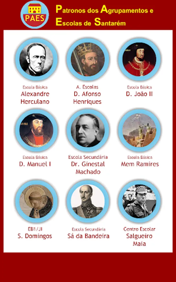 The map of the Patrons of the Groupings / Santarém county schools was conducted from biographies and drawings made by students, coordinated by librarians teachers of the respective Groups / Schools.