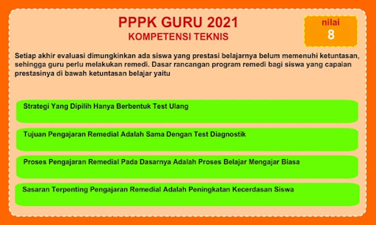 In this application contains hundreds of questions that will be displayed randomly by the application so that teachers can practice their technical skills. In this exercise, there will be twenty questions that must be answered by the teacher. and each repeat test will display a different question that has been randomized by the application.