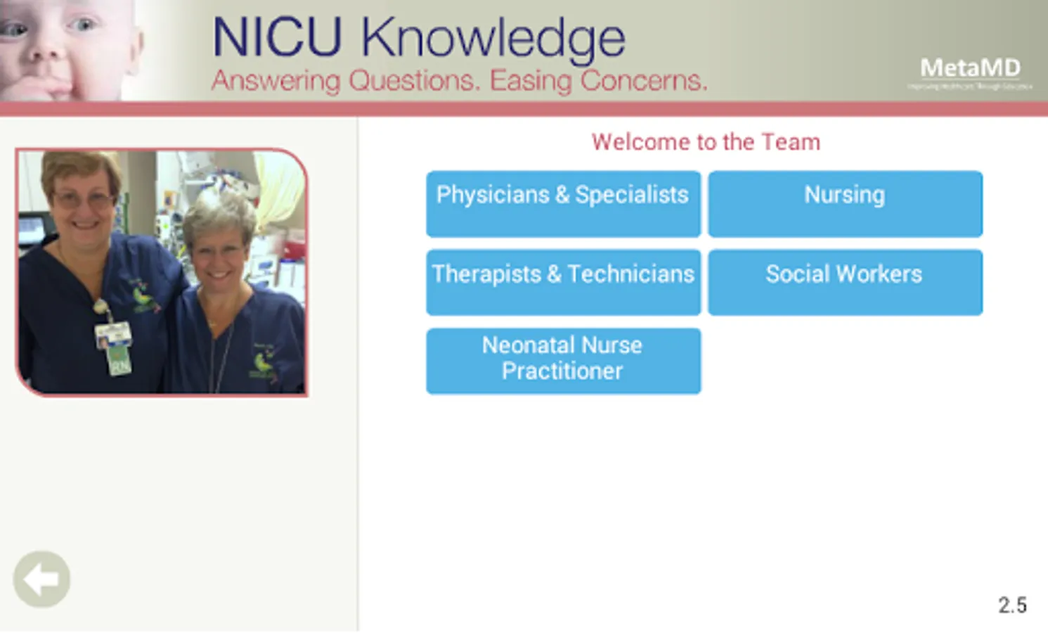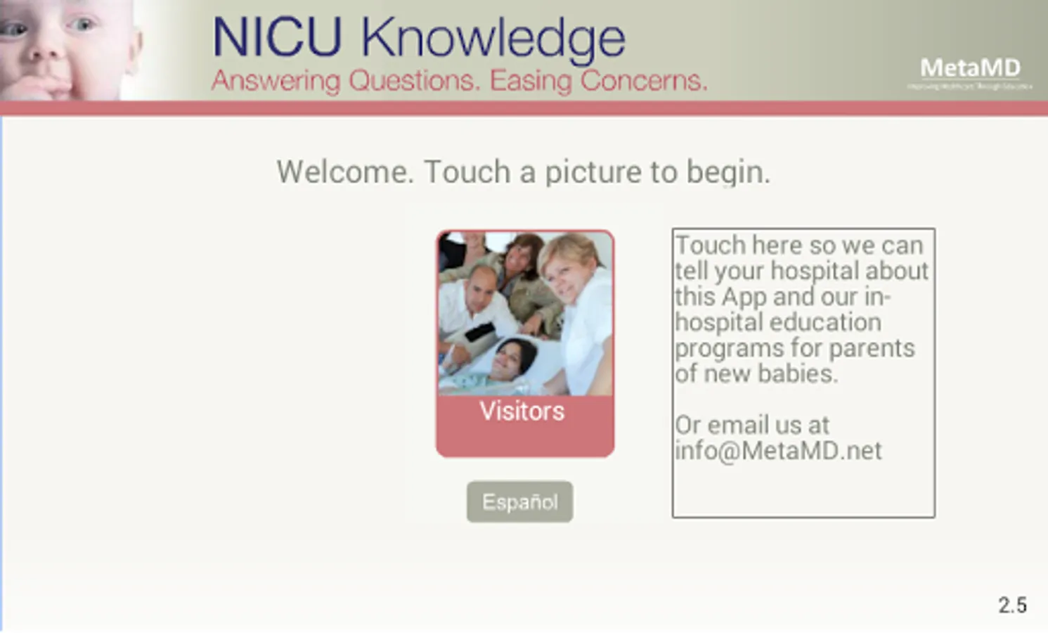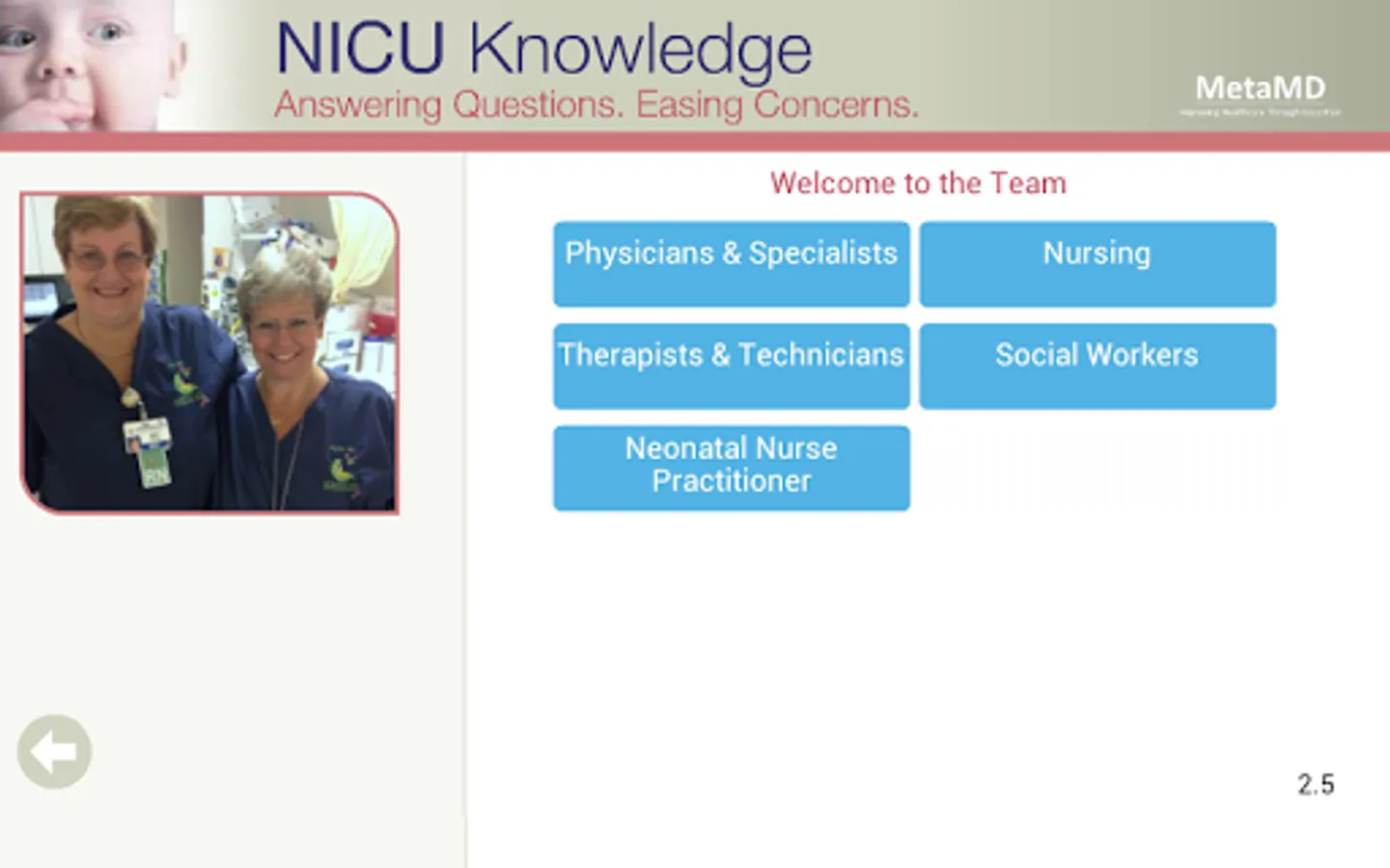 For more information about the full NICU Knowledge educational program and how your hospital can participate, please call Patient Education Programs at 804-327-1113 or email PatientEducation@MetaMD.net.