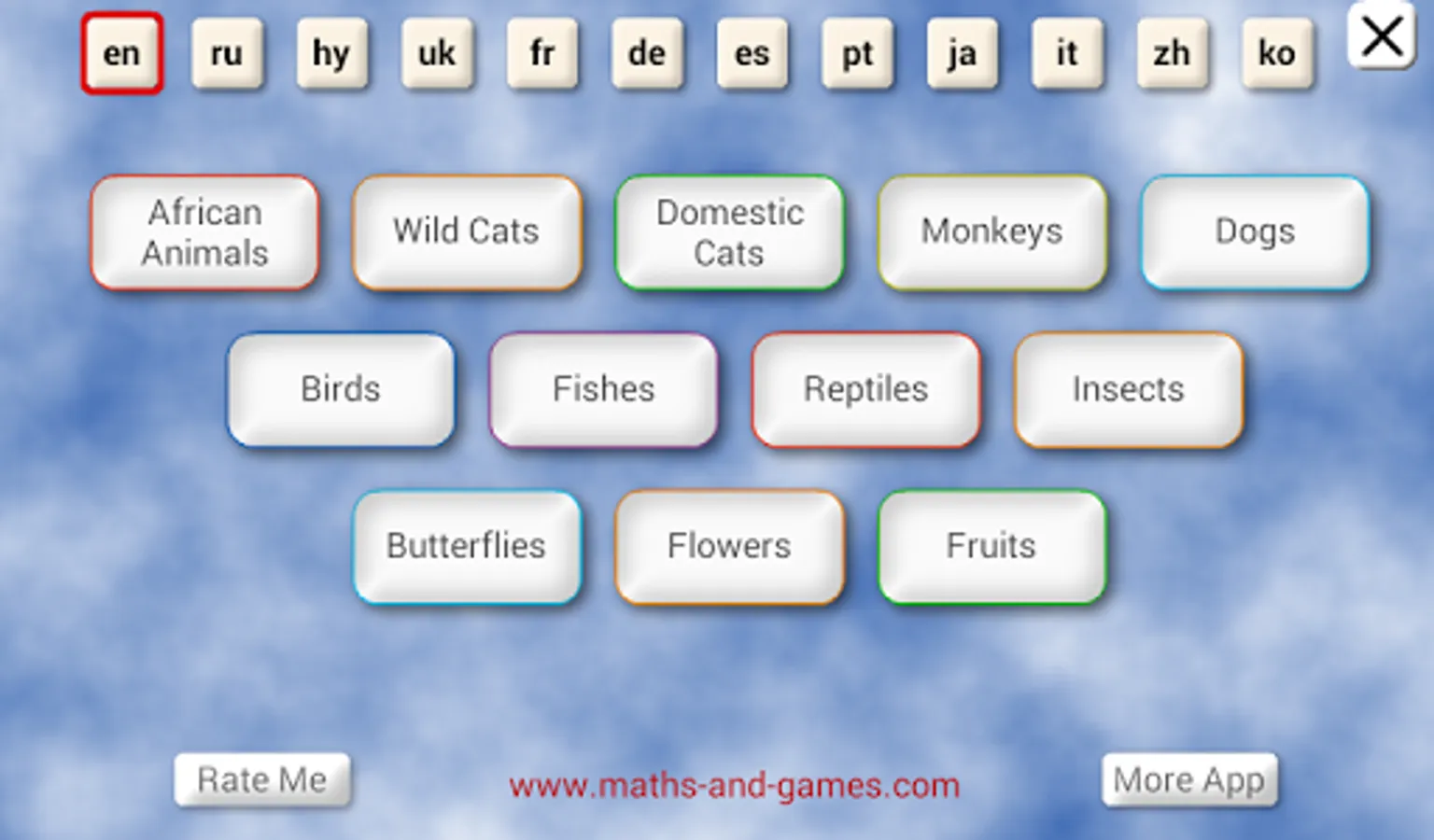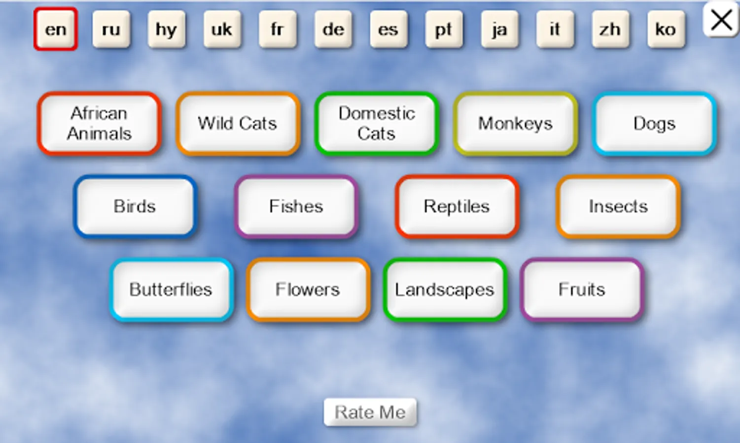 ❂ 13 different topics: "African Animals", "Birds", "Fishes", "Flowers", "Fruits", "Butterflies", "Domestic Cats", "Dogs", "Insects", "Reptiles", "Monkeys", "Wild Cats", "Landscapes";