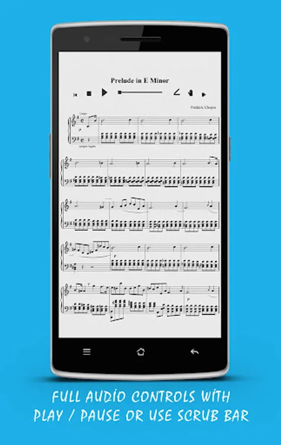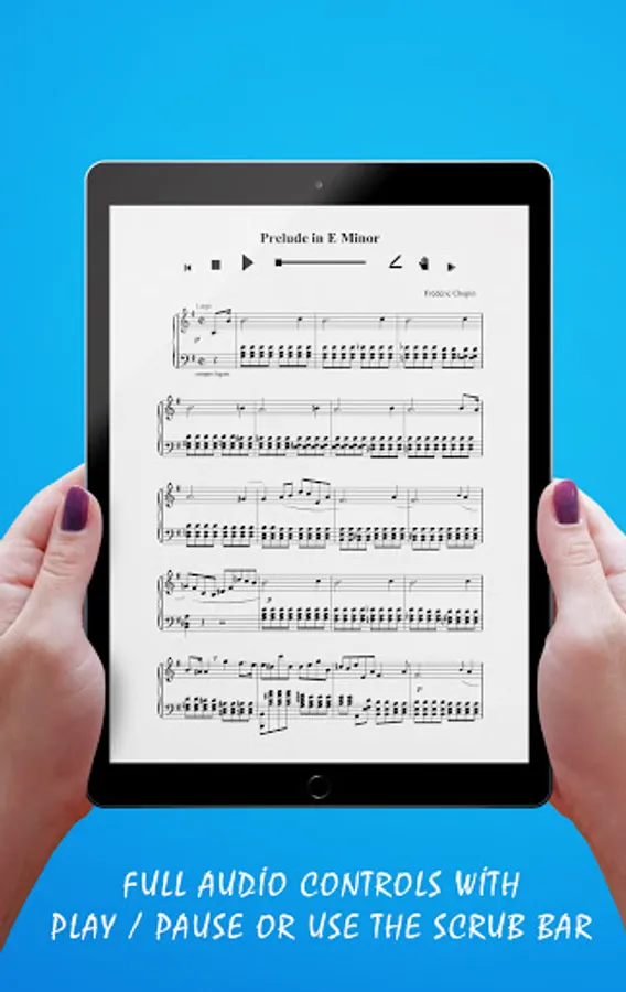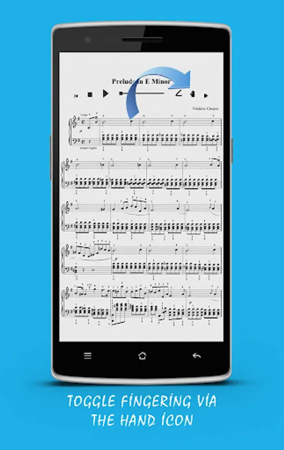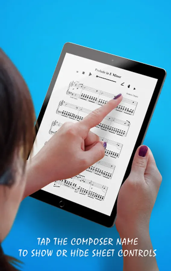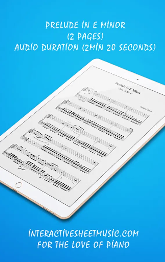 Our Chopin, Prelude in E Minor Piano Sheet Music App - Opus 28, No.4 (2 pages) contains interactive features hidden from view upon launch yet quickly accessible when you need them. Tap on the composer name (Frédéric Chopin) to show or hide annotation and fingering or play audio from specific parts of the songbook.