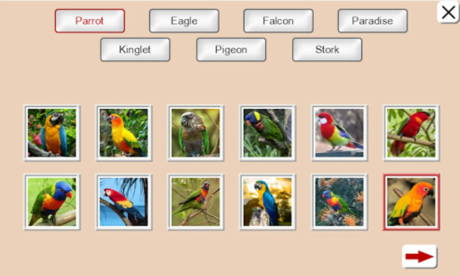 - 7 themes: "Stork", "Eagle", "Falcon", "Paradise", "Kinglet", "Columba ", "Parrot»;
