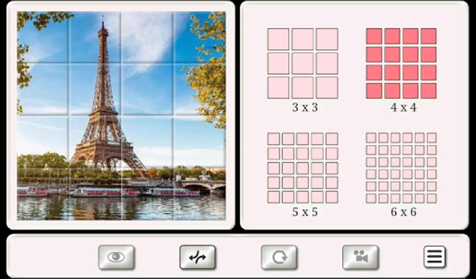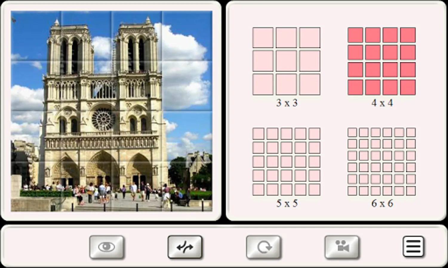 – 4 levels of puzzle difficulty-3x3, 4x4, 5x5, 6x6;