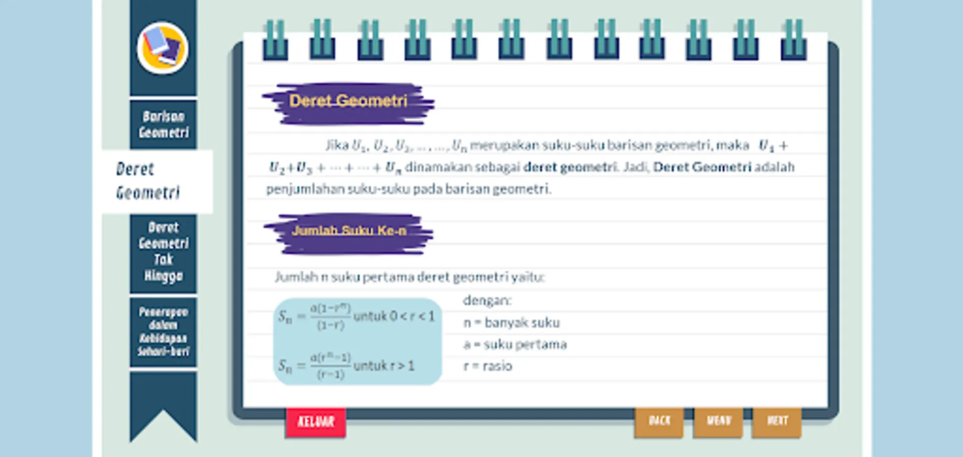 By using RISTI learning media, learning mathematics on geometric series material certainly becomes easier! Not only learning, you can also while playing!