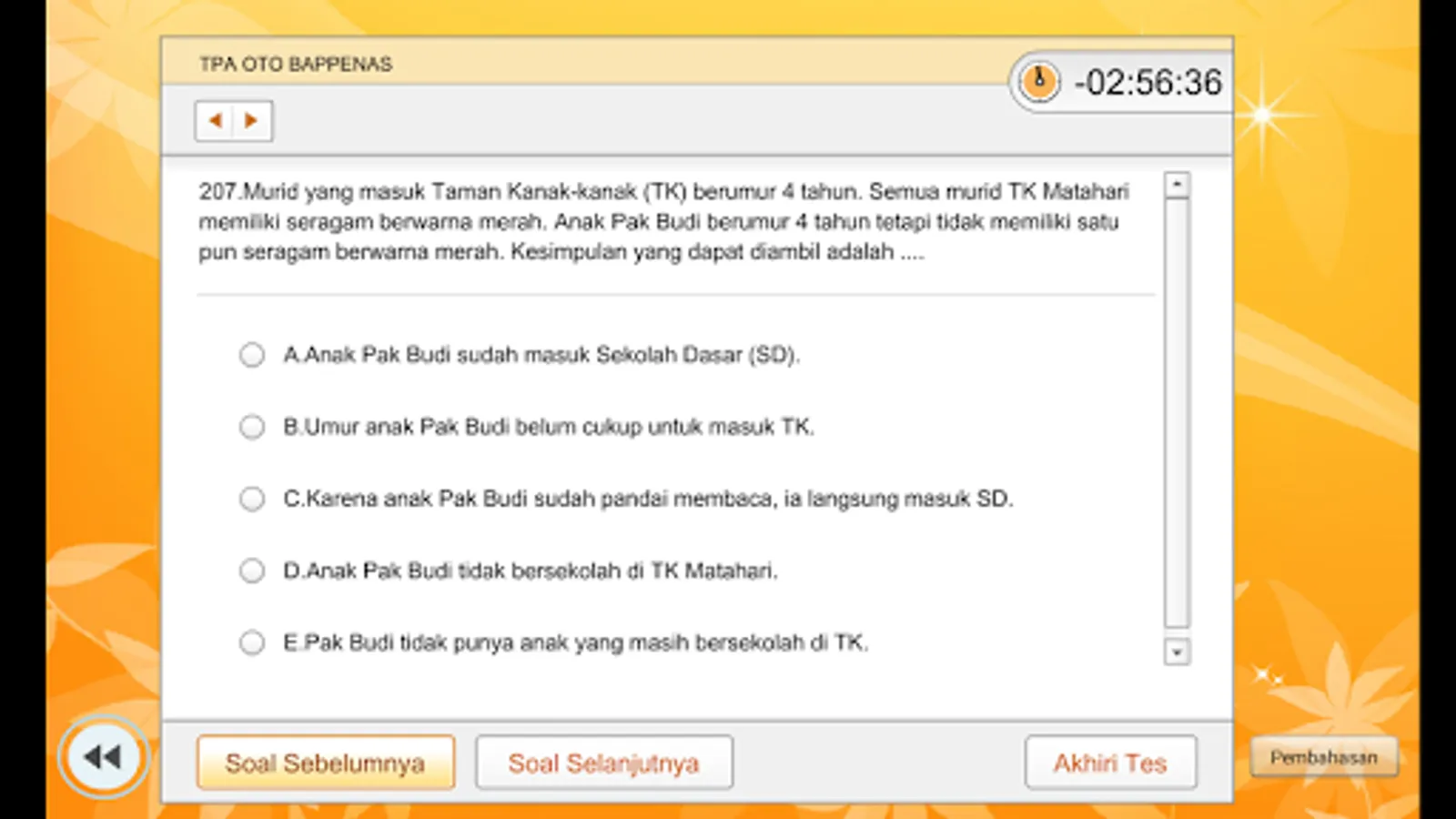This application is a component of landfill OTO Bappenas book published by Kompas Science Publishers, In this application provides exam simulation TPA OTO Bappenas for all customers who buy a book Instant Lejitkan TPA OTO Bappenas. In this application contains 250 TPA OTO Bappenas matter that must be done within 180 minutes. The time that is included in this application has been designed in accordance with actual exam time. There is also an automatic timer and a score DISCUSSION detailed and easy to understand.