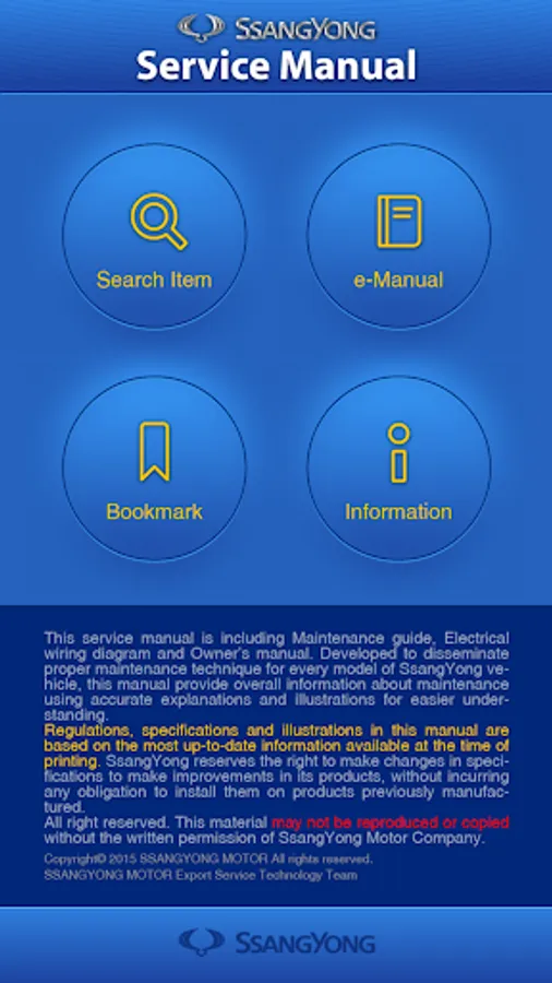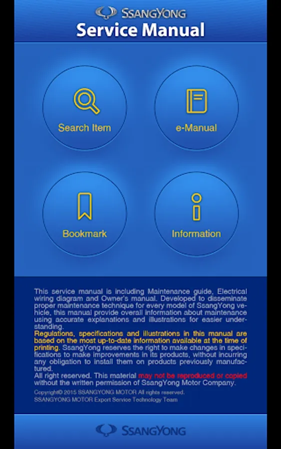 This application is composed of service manual, electrical schematic diagram, and owner’s manual of KG Mobility Company and has been developed to disseminate right maintenance techniques for all vehicle models which our company has developed.