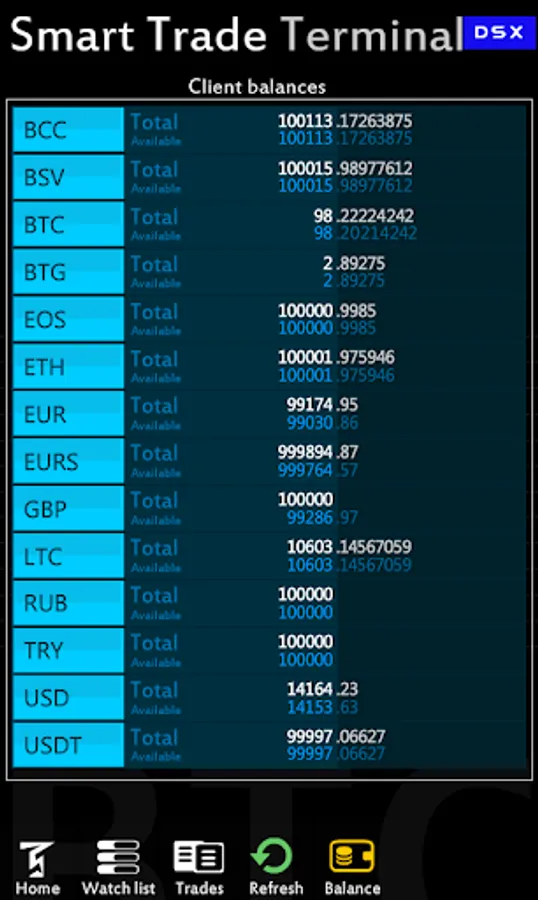 BCC, BSV, BTC, BTG, EOS, ETH, EUR, GBP, LTC, USD, USDT.