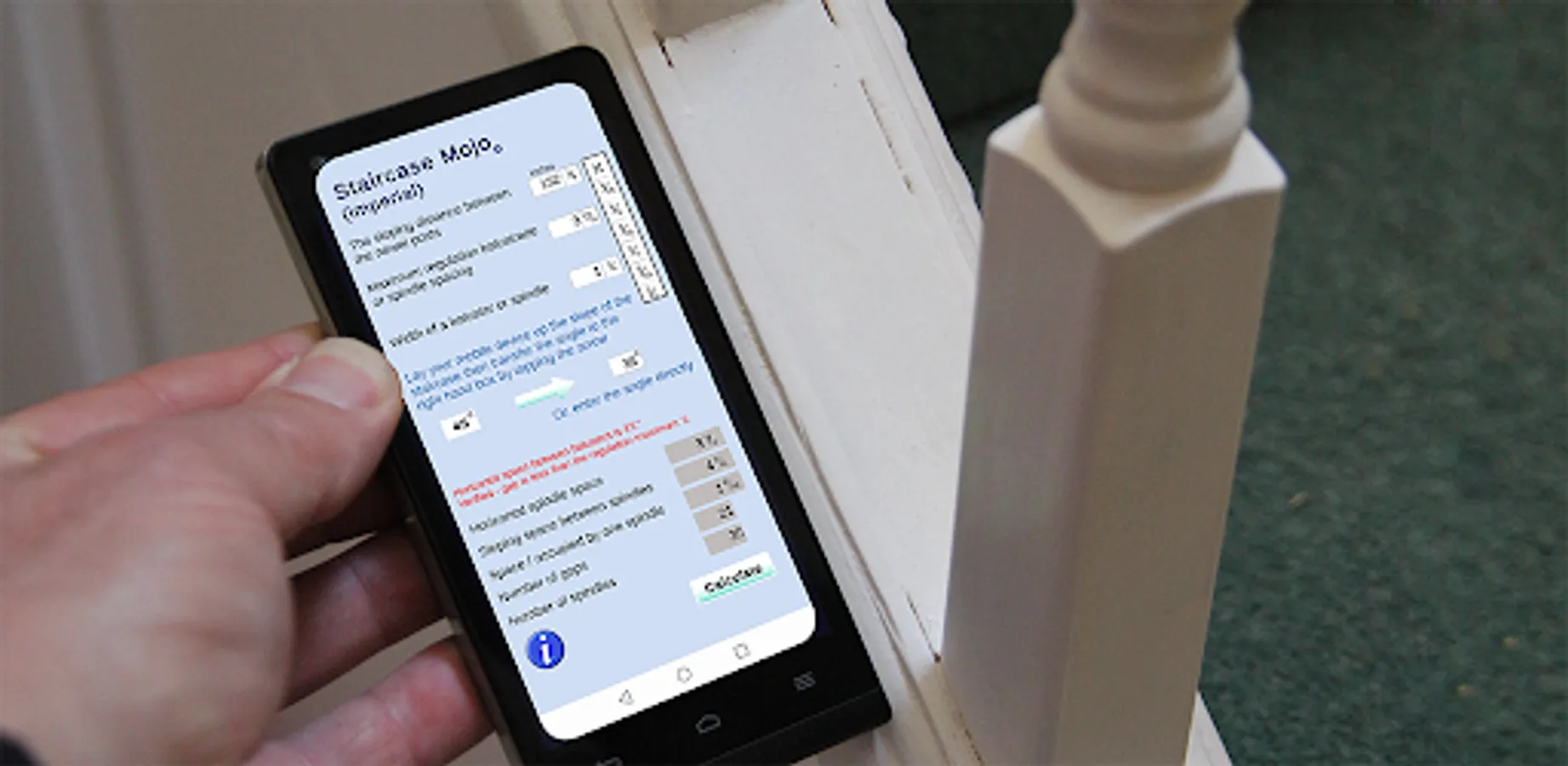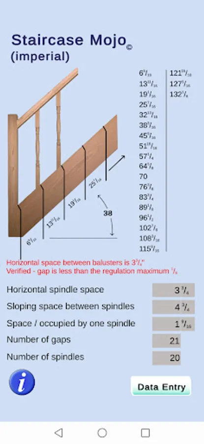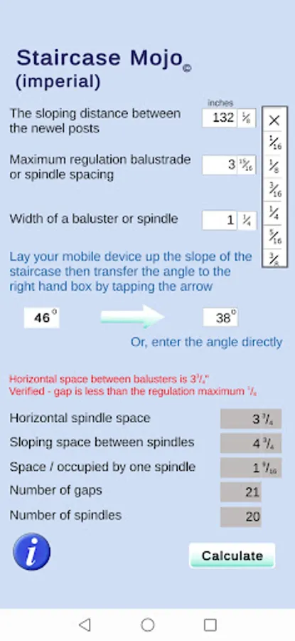 When you have completed filling in the 4 entry boxes then tap on the "Calculate" button to show the results with a list of baluster positions adjusted for the slope.