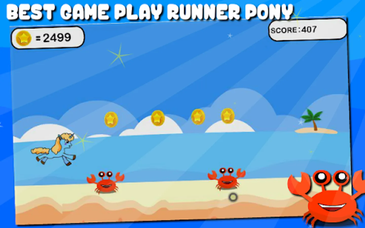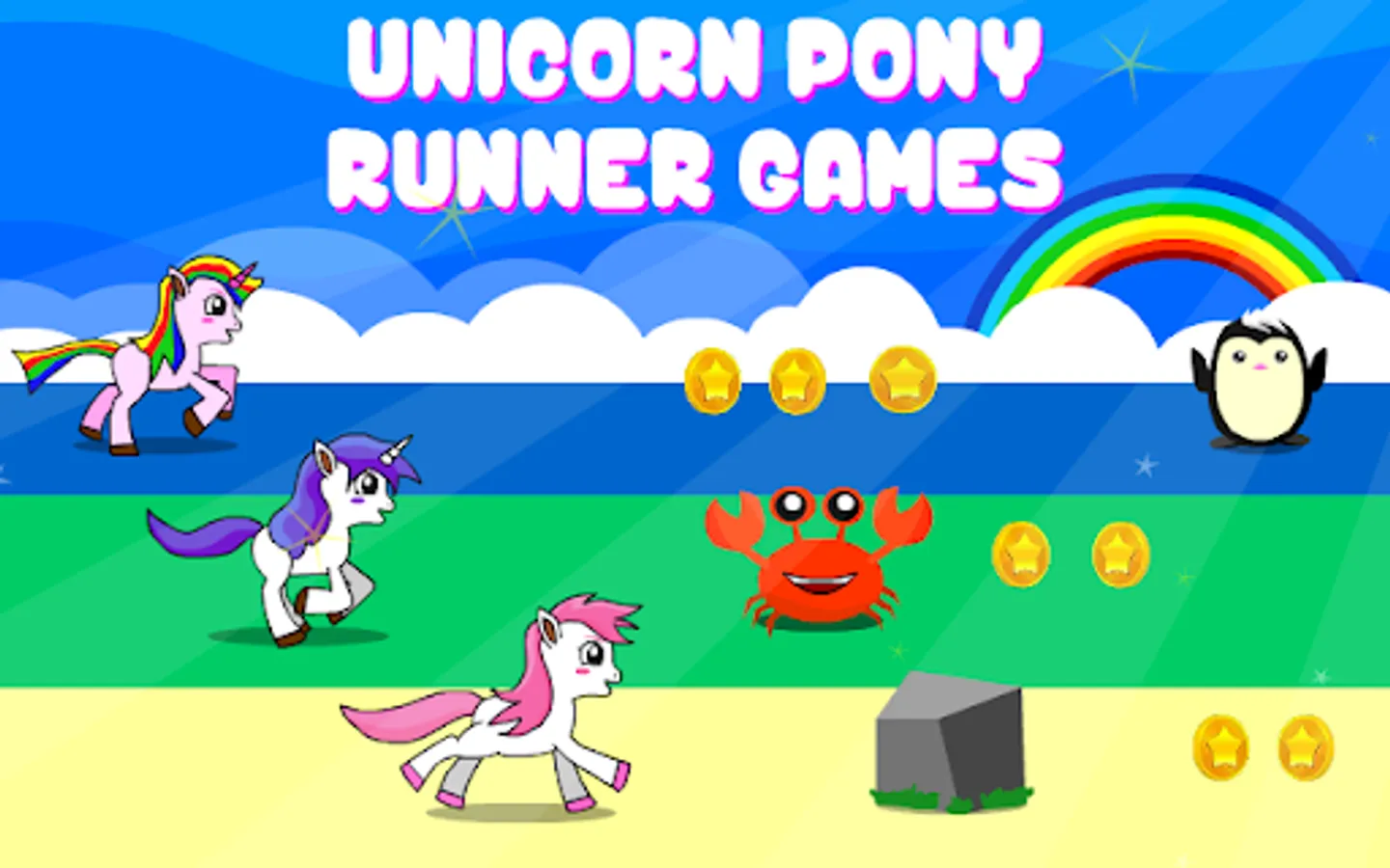 Hello kids do you like unicorn pony? Come on, it's time to play unicorn pony, let's run and race, Dash Jump and Fly, let's collect as many coins as possible to open and play unicorn friends, full of rainbow colors, run and avoid rocks, penguins, wood, coconut and crabs annoying.