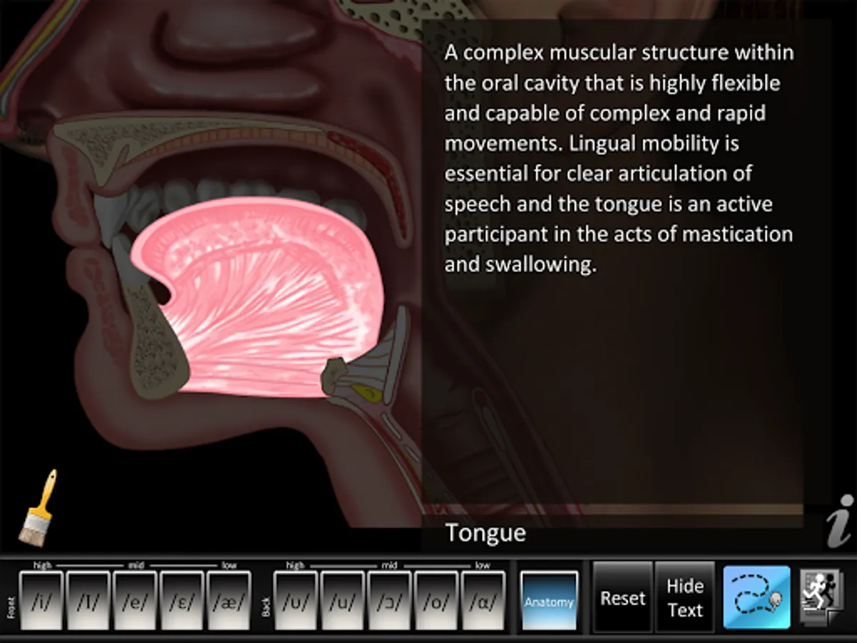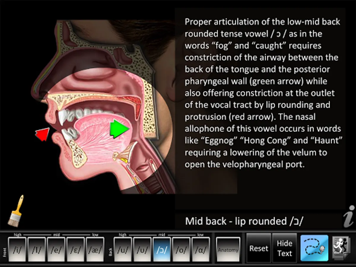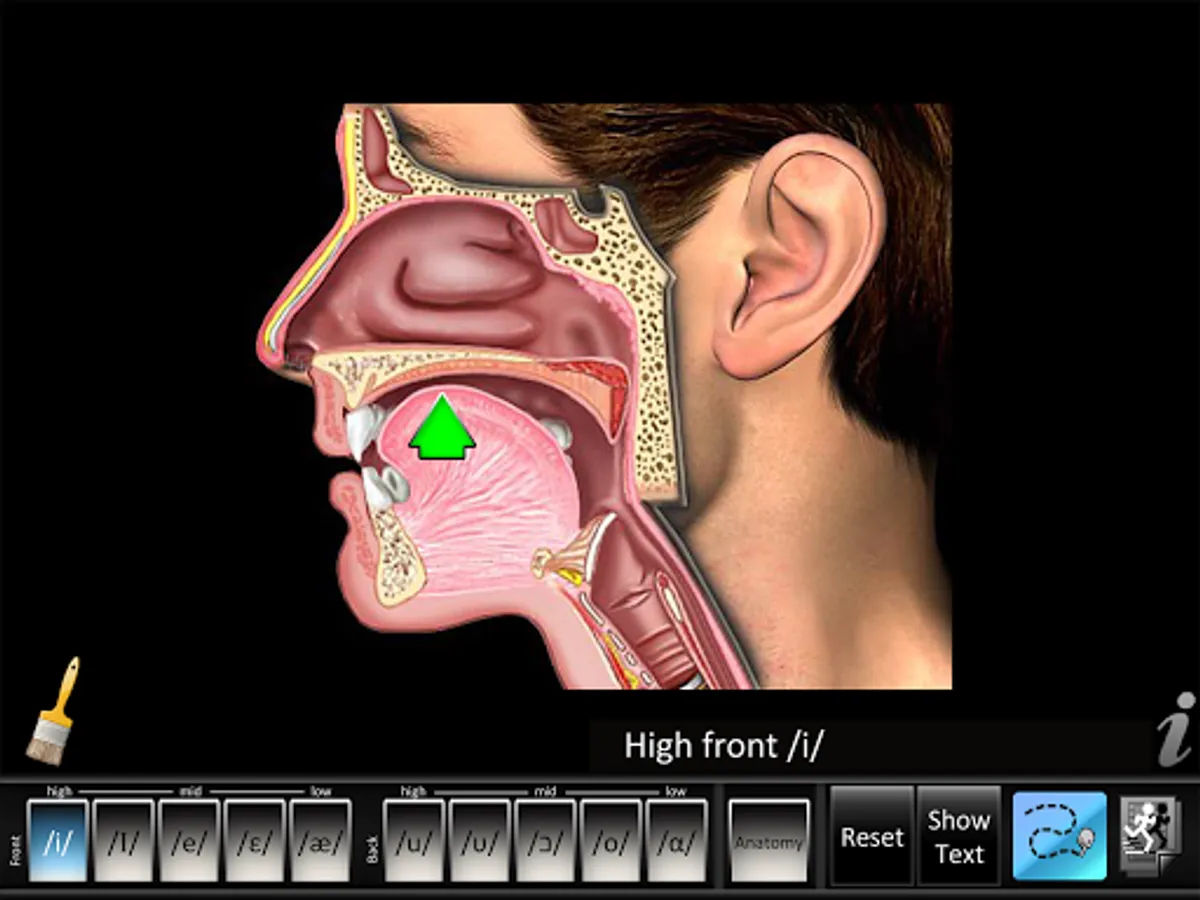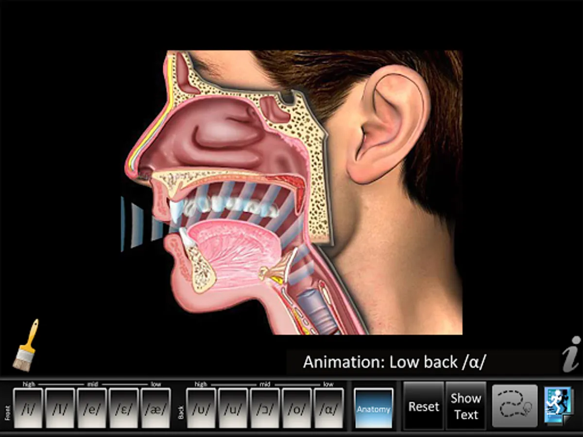 • Animations: each vowel shows a lateral view of dynamic movements of the jaw, lips, tongue, velum (soft palate), and larynx needed for proper articulation of that vowel. Audio for each vowel sound is synchronized with the dynamic animations. Anatomy animation included.