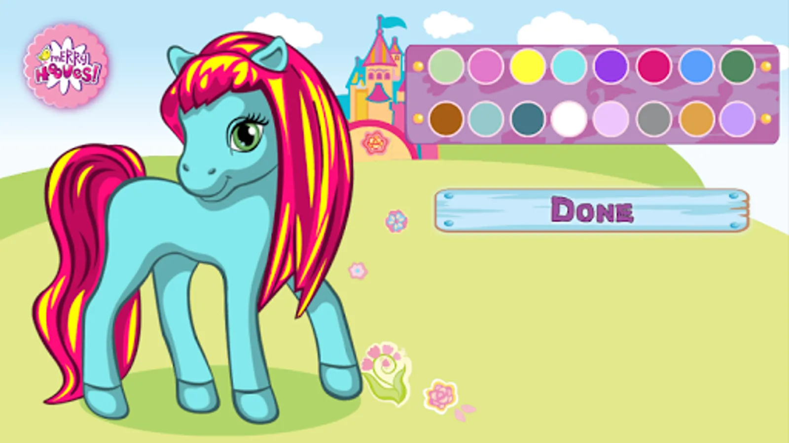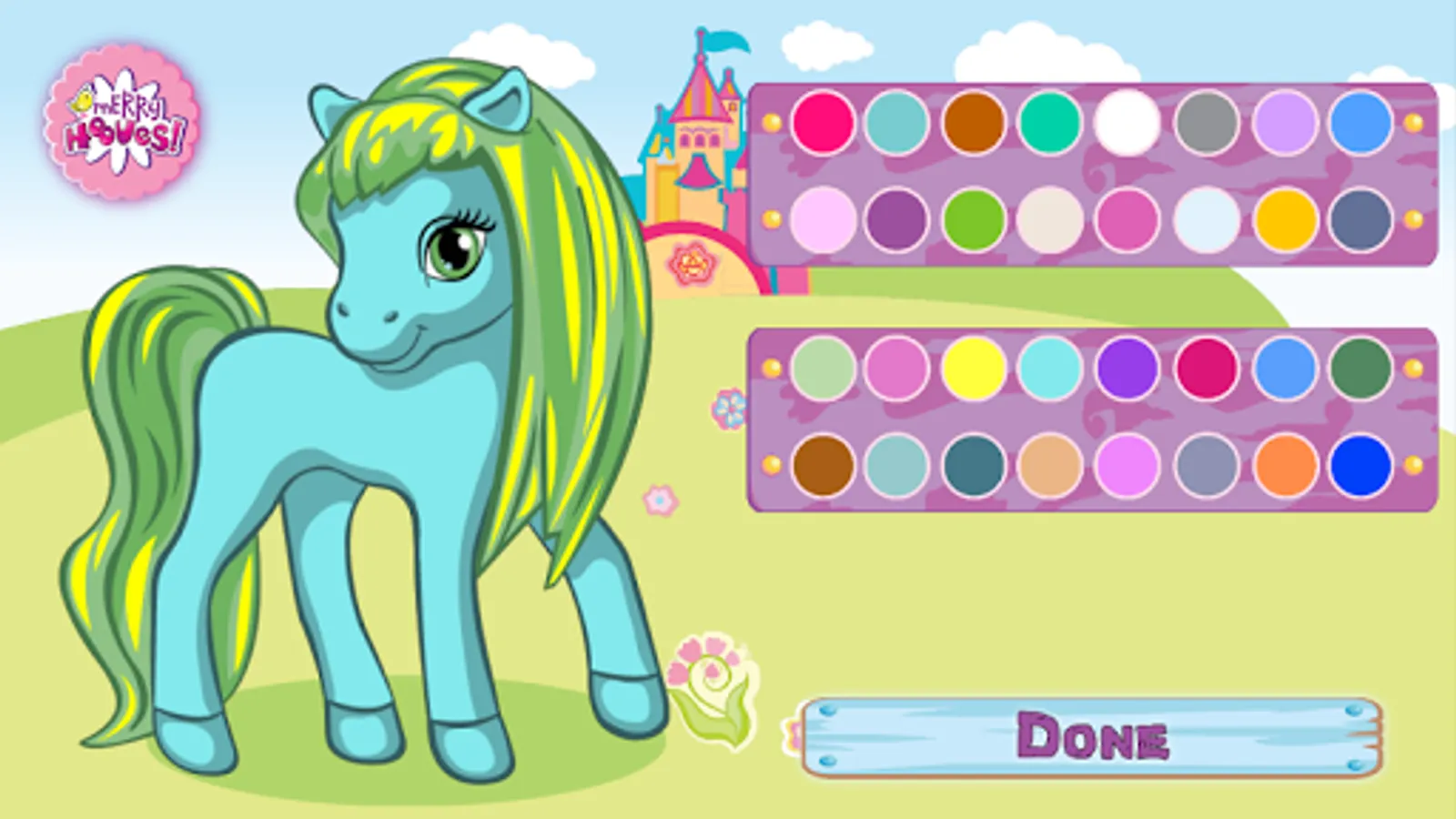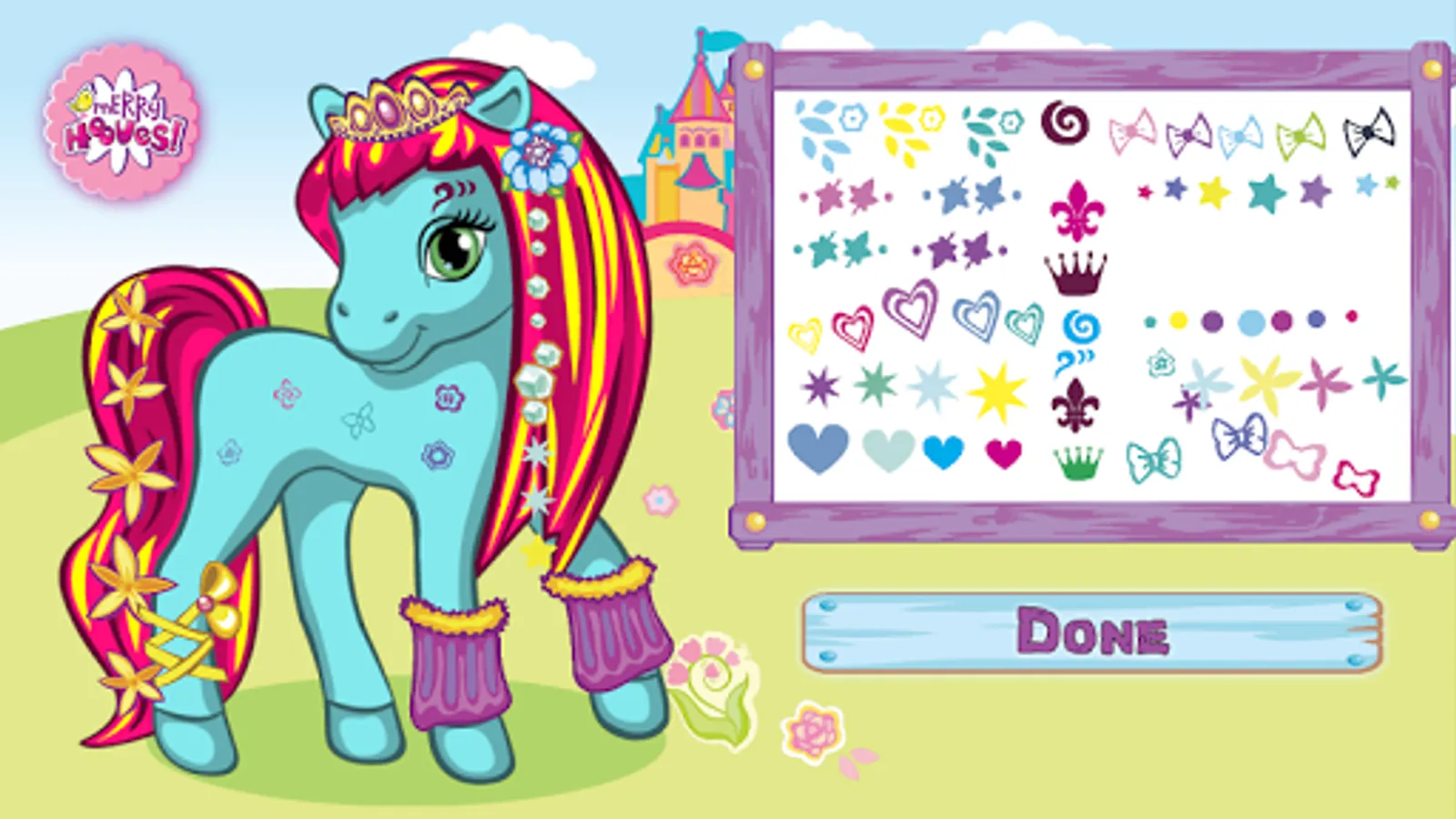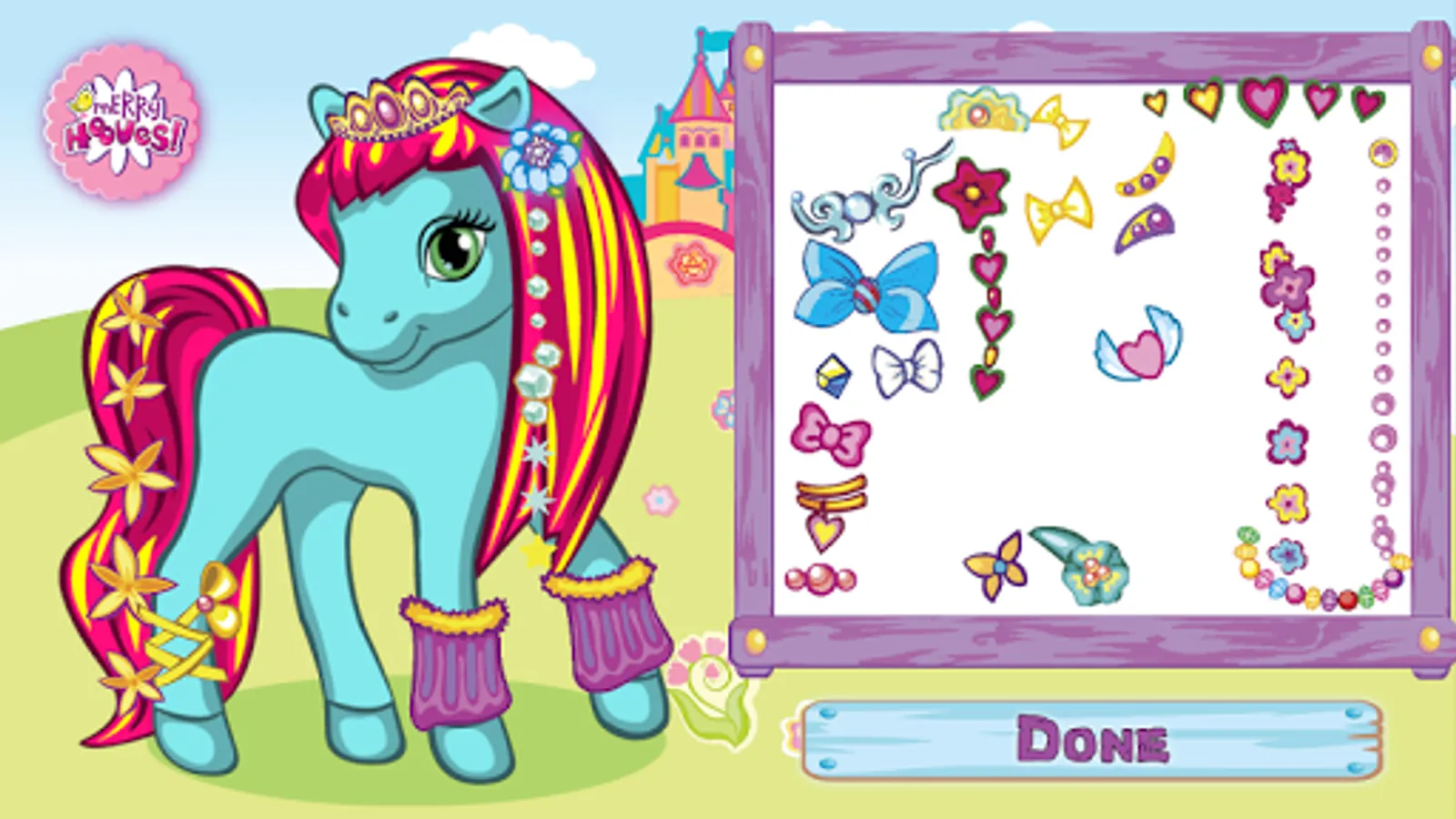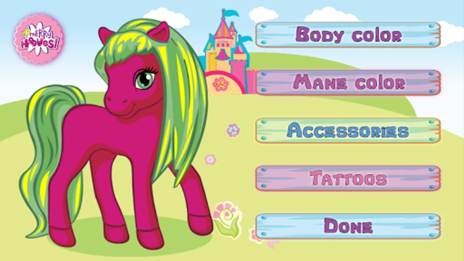 Merry Hooves are little pretty ponies from far-far-away country. Their flock covering is soft to the touch. Magnificent manes have different bright colors. Amazing accessories decorate all ponies’ manes and tails.