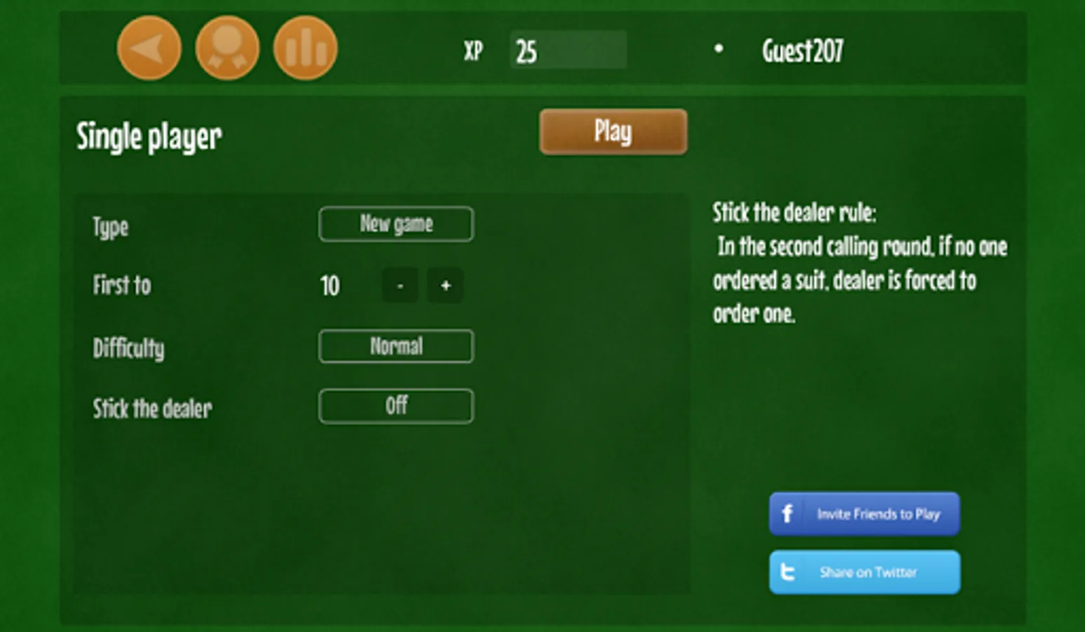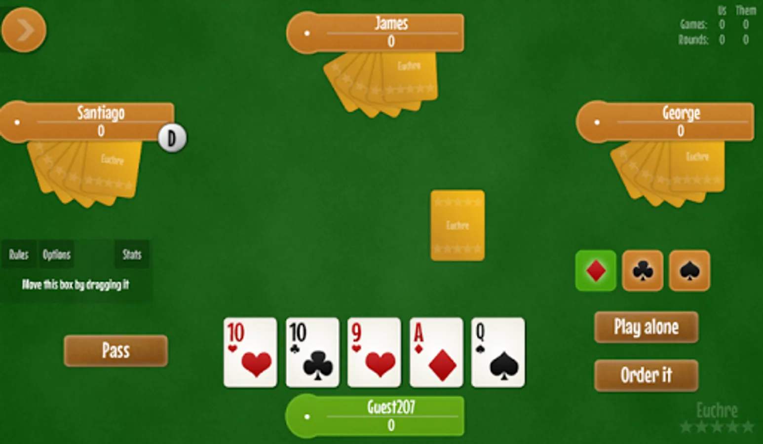 In round 2, players have the option to name a suit (other than turn-up card's suit), to pass turn or to name a suit and play alone against another team. If stick the dealer rule is on, the dealer (last one to make a choice) will be forced to name a trump in the round 2, else, if it's set to off, the dealer button moves to next players and cards will be reshuffled.