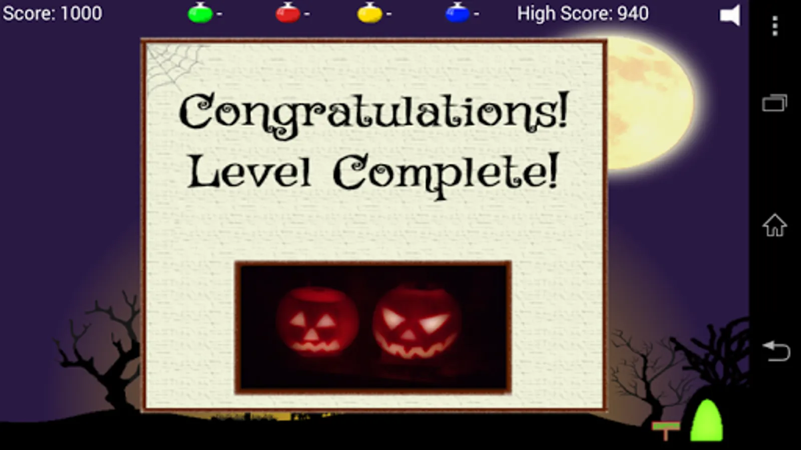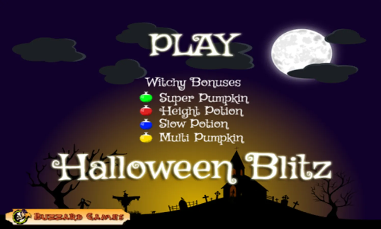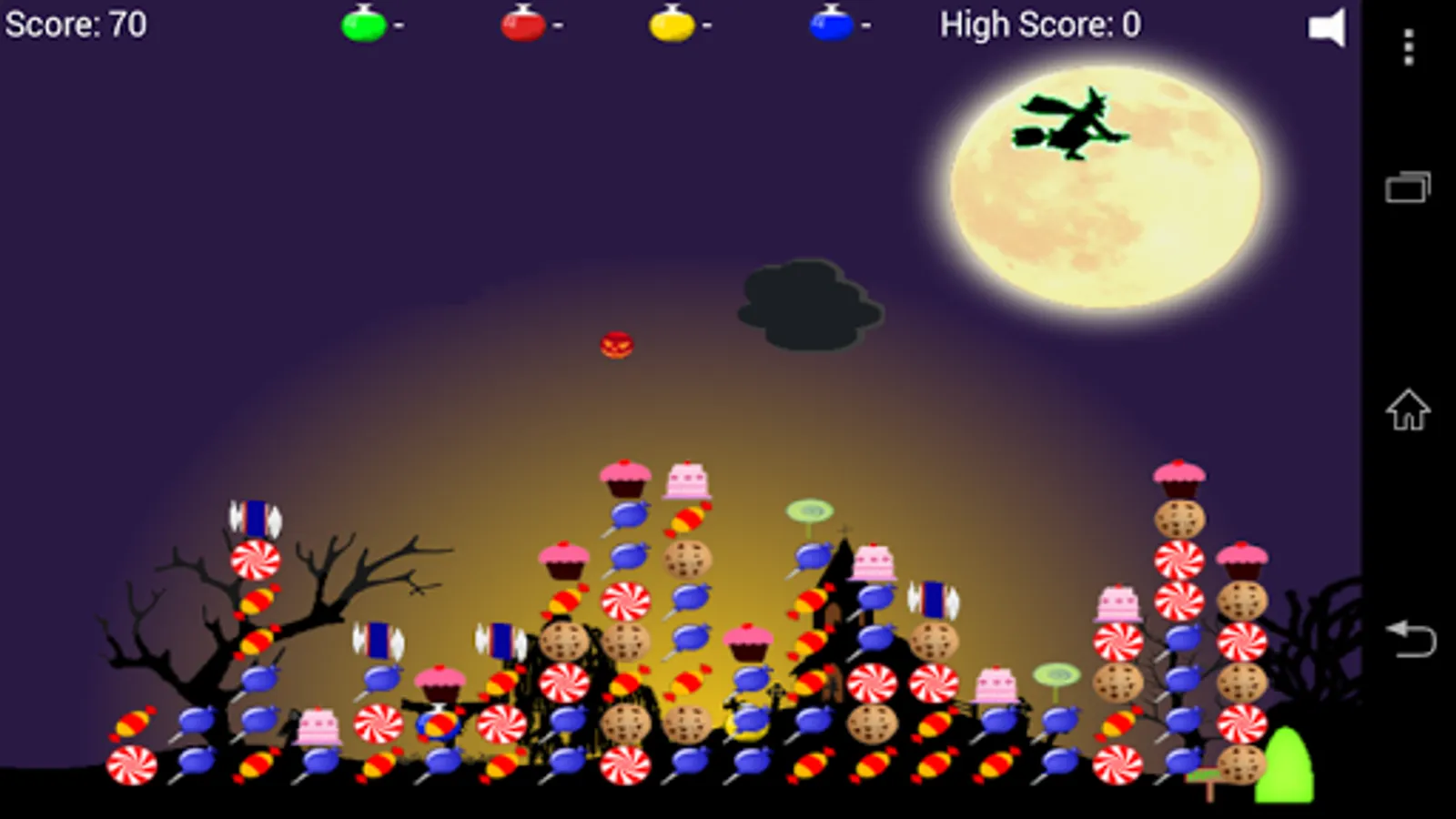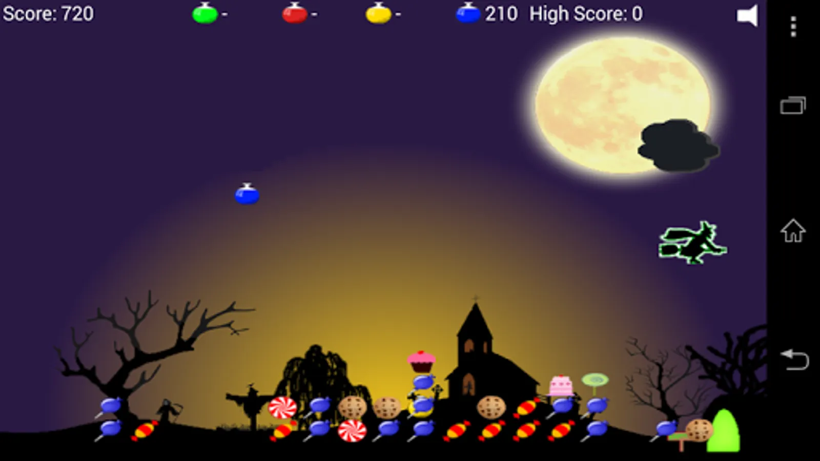 Your evil spell to makes the children's Halloween sweets disappear has gone wrong! You've cast the wrong spell and instead made them huge! They now block the entrance to your grotto and your flying potion is wearing out! Clear the sweeties by dropping pumpkins on them before you crash into them! Download now for free Halloween fun!