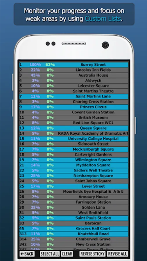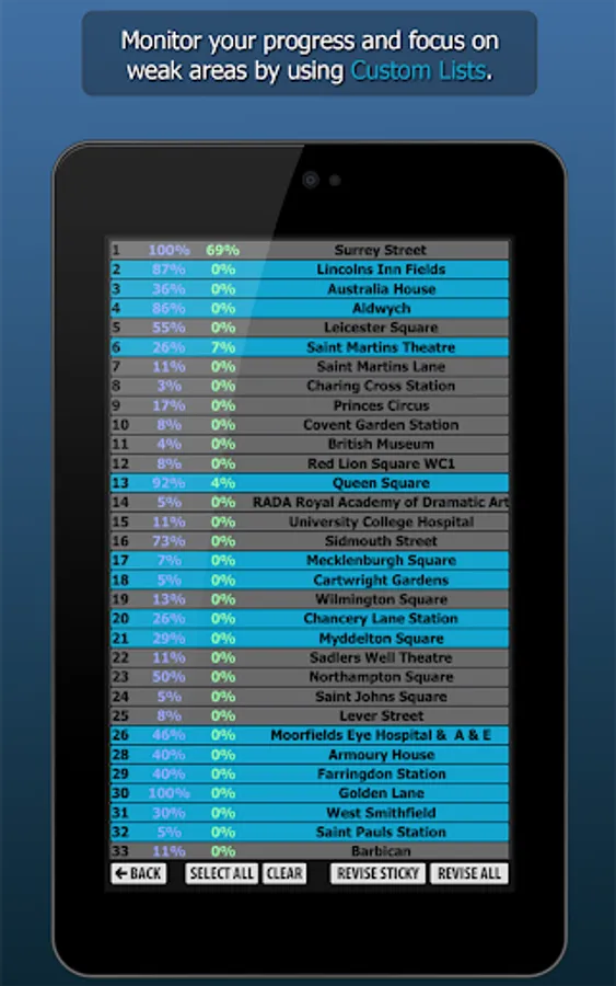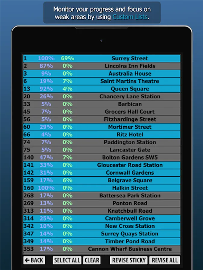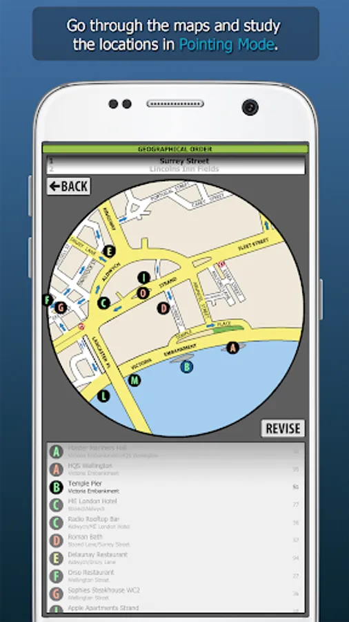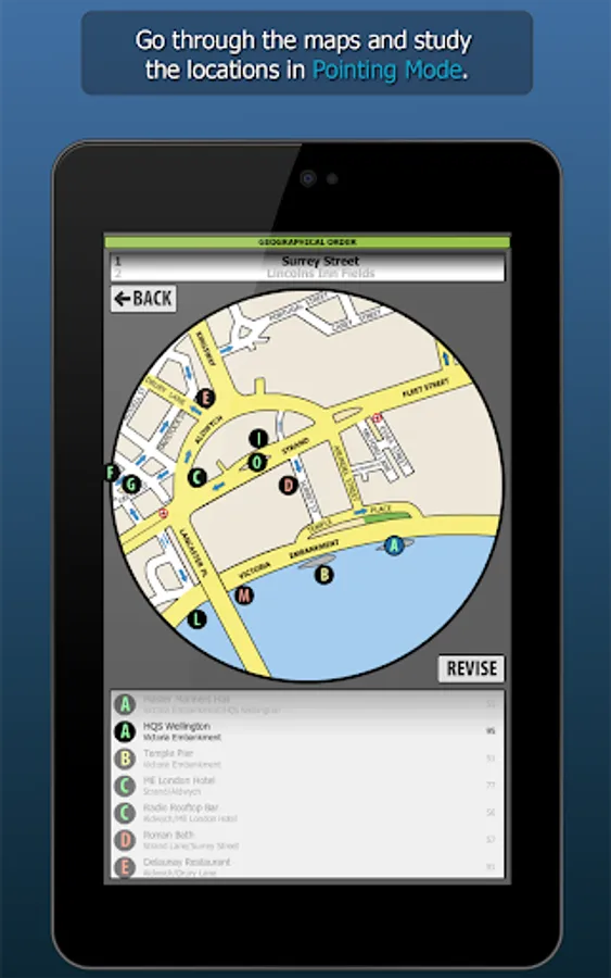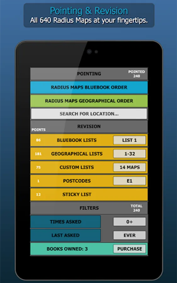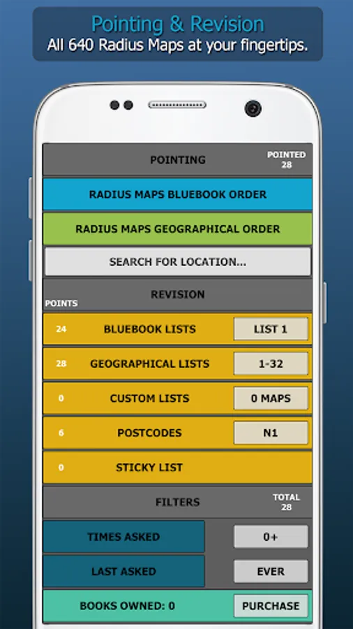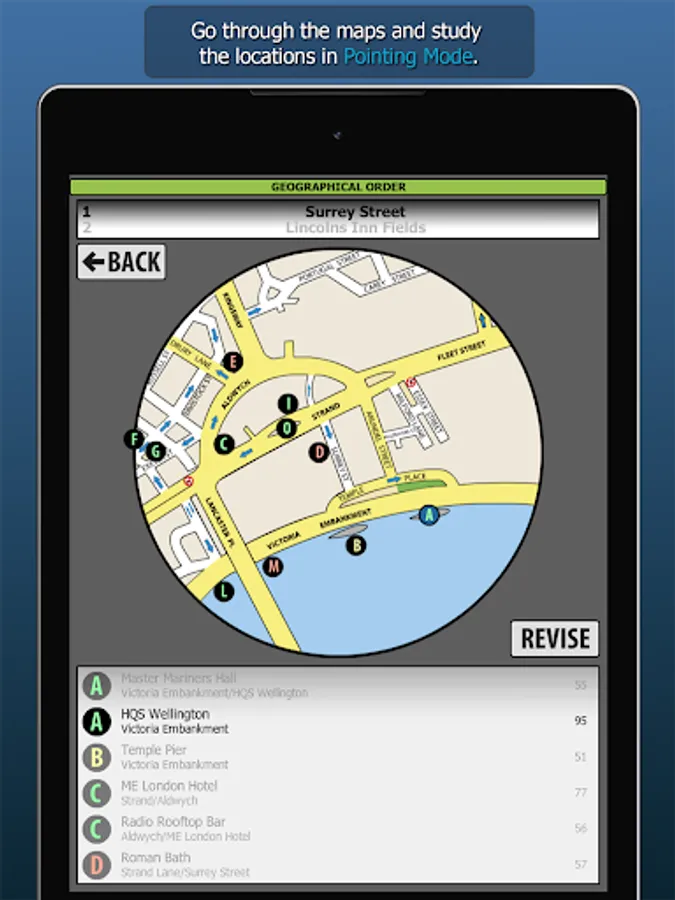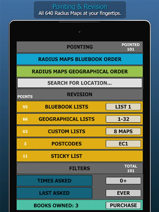 WizAnn Radius Maps Application - The complete tool for pointing and revising the Radius Maps for the Knowledge of London. When studying to become a licensed London taxi driver you will be required to search the quarter mile radius at the start and finish of each bluebook point. The full app contains all 640 radius maps in both bluebook order and geographical order, so regardless of the way you choose to study them you will be able to make good use of this tool. The points are displayed clearly on colour maps and the filters are in plain view and easy to operate. Revision is straight forward and you can create custom revision lists. The search function allows you to search for any specific point in the maps.
