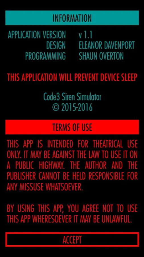 This application is a simple, cost effective solution to needing high quality, interactive warning sirens as part of film, television, or theatre without the need for expensive, dedicated siren units. For best results, connect an external loudspeaker to your mobile device. Ideal for Medics, First Responders (see disclaimer), and onsite Security where siren units would cost way too much.