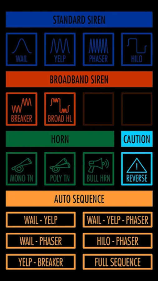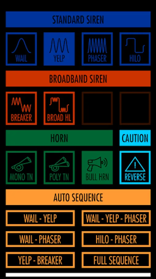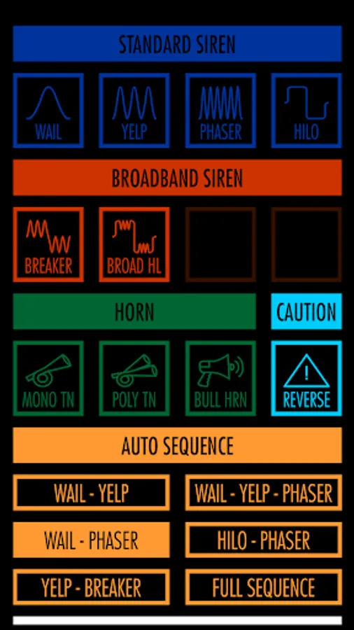 Additional functions include predefined siren patterns (yellow) which will cycle through until stopped, or you take control by tapping another siren.