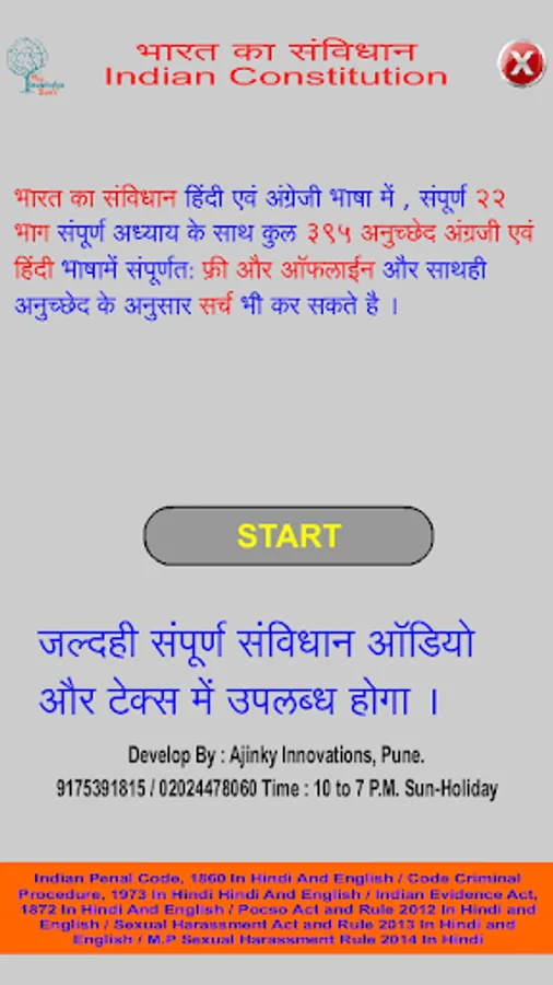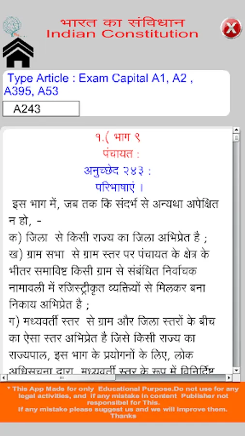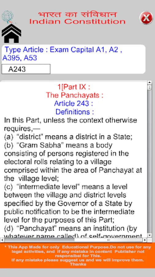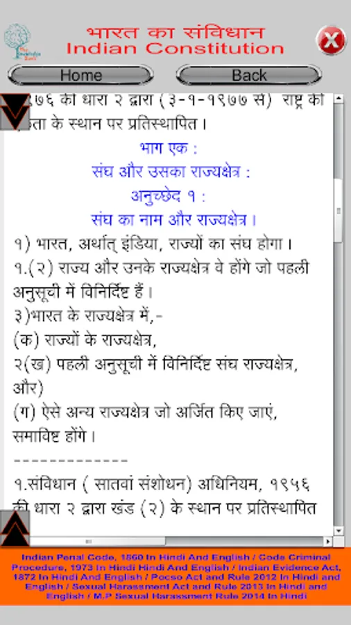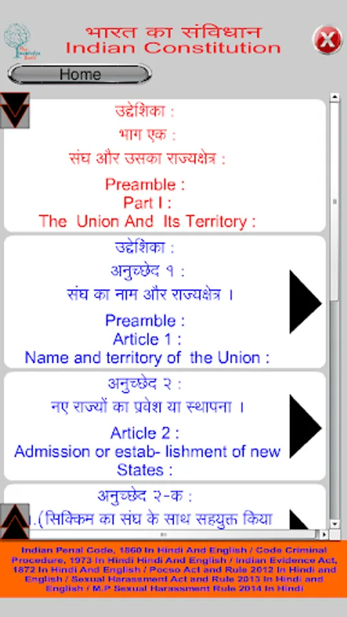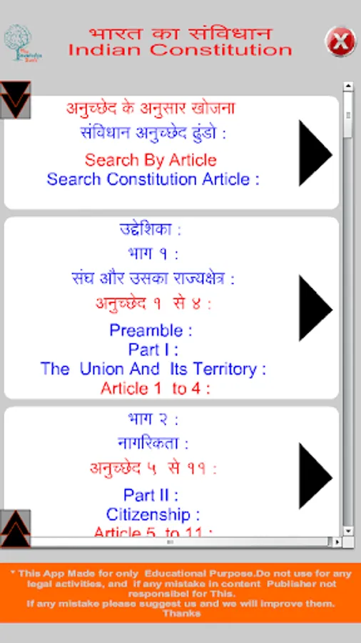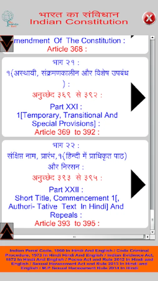 In this application read all information of Indian Constitution (Bhartiya Samvidhan) in Hindi and English format. Bharat ka Samvidhan app includes Preamble, All 395 Article, all 22 Parts and their chapter with full description. Also In this app student can search Any Article like if want to search Article 35 then Type in search box A35.