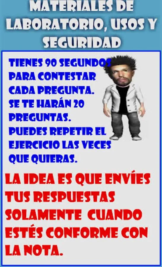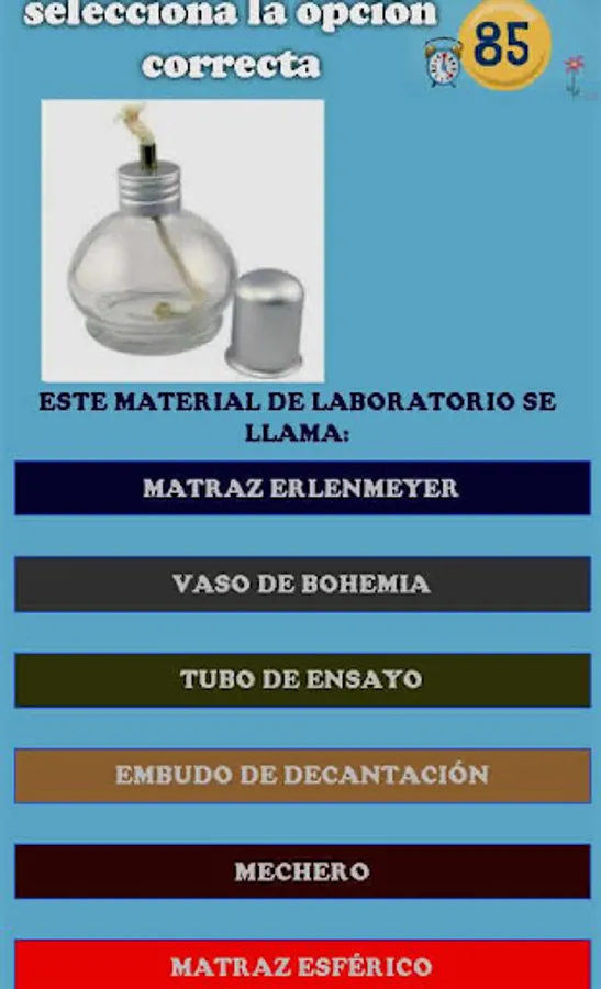 Trivia about laboratory materials and safety measures. Application designed for students of introductory chemistry courses.