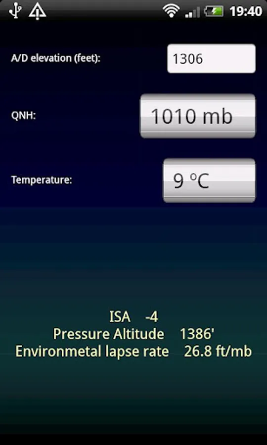 - Calculate the aerodrome pressure altitude, ISA deviation and environmental lapse rate by entering the QNH, temperature and aerodrome elevation