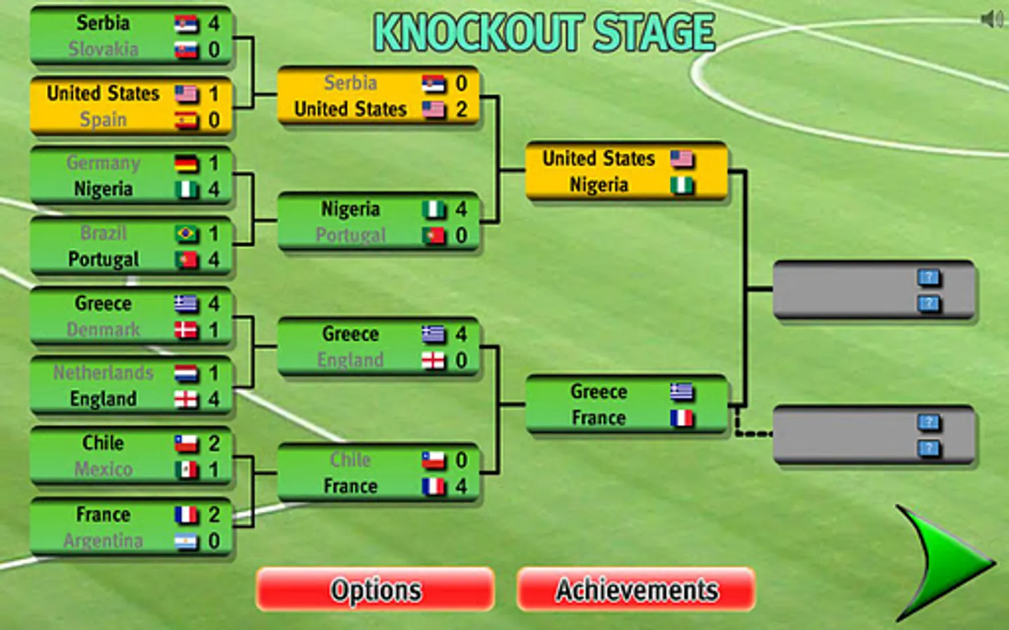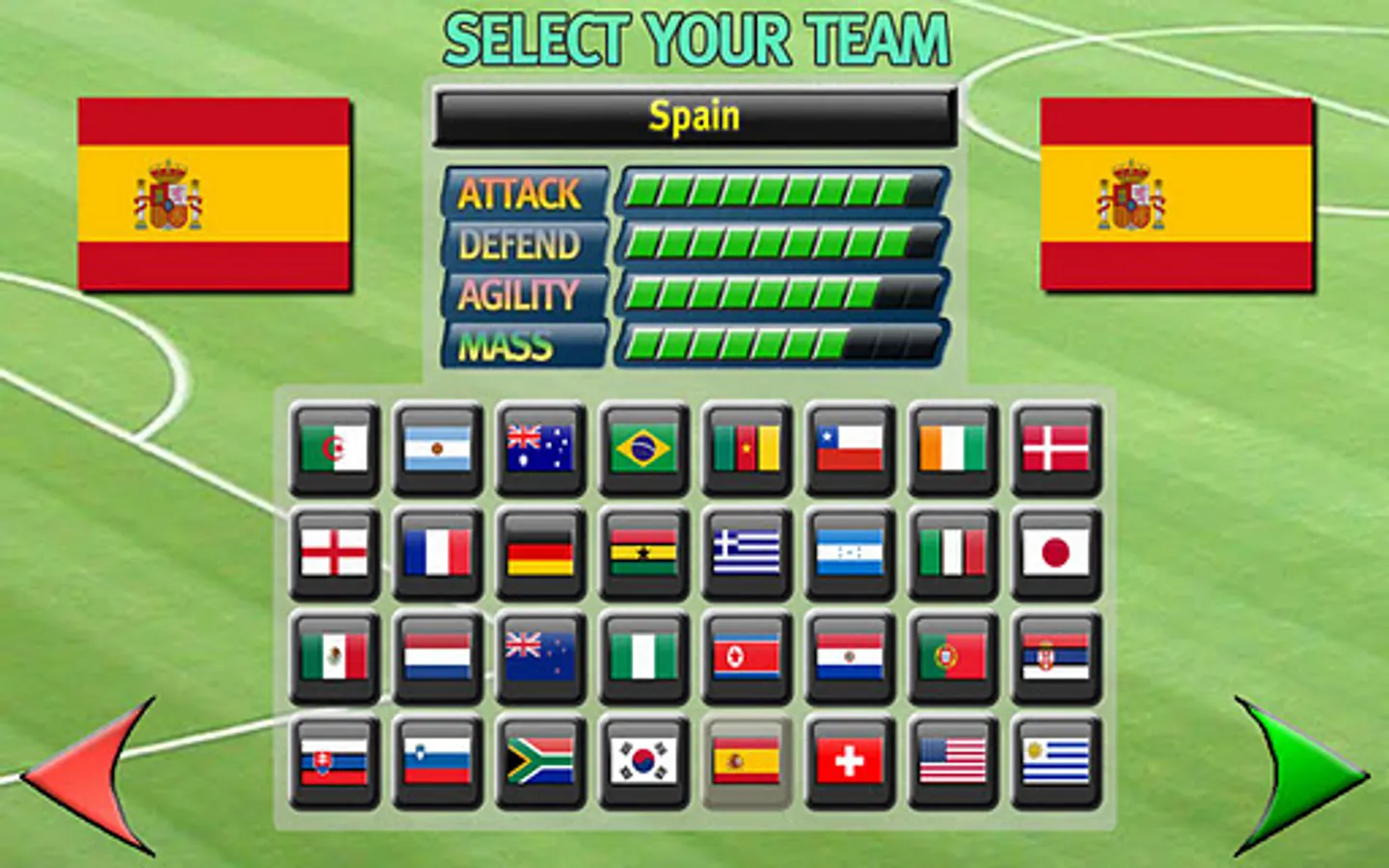 Play a complete world cup, using any of the 32 national teams or play a quick match against the CPU