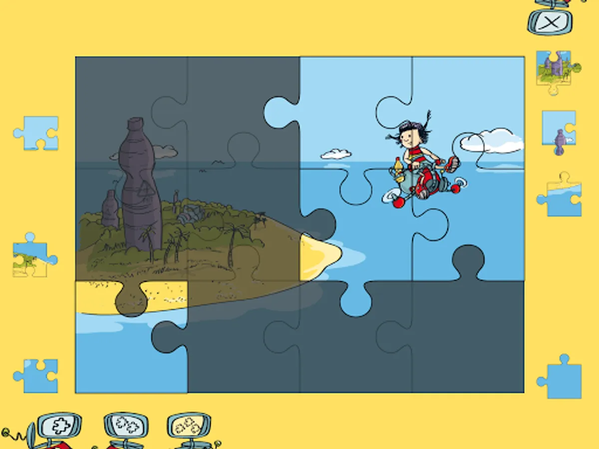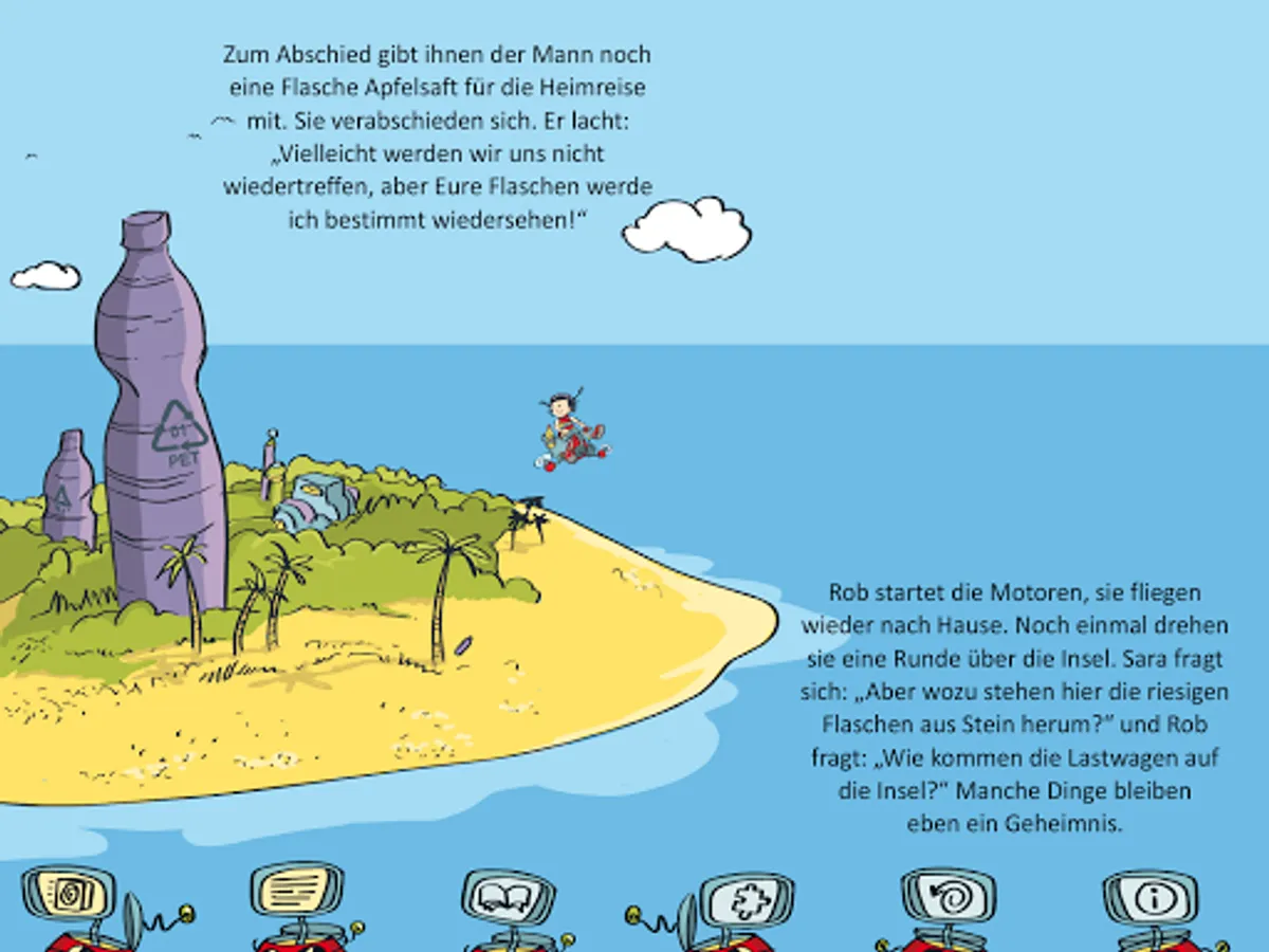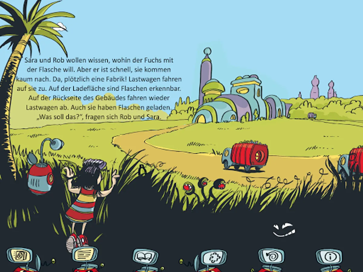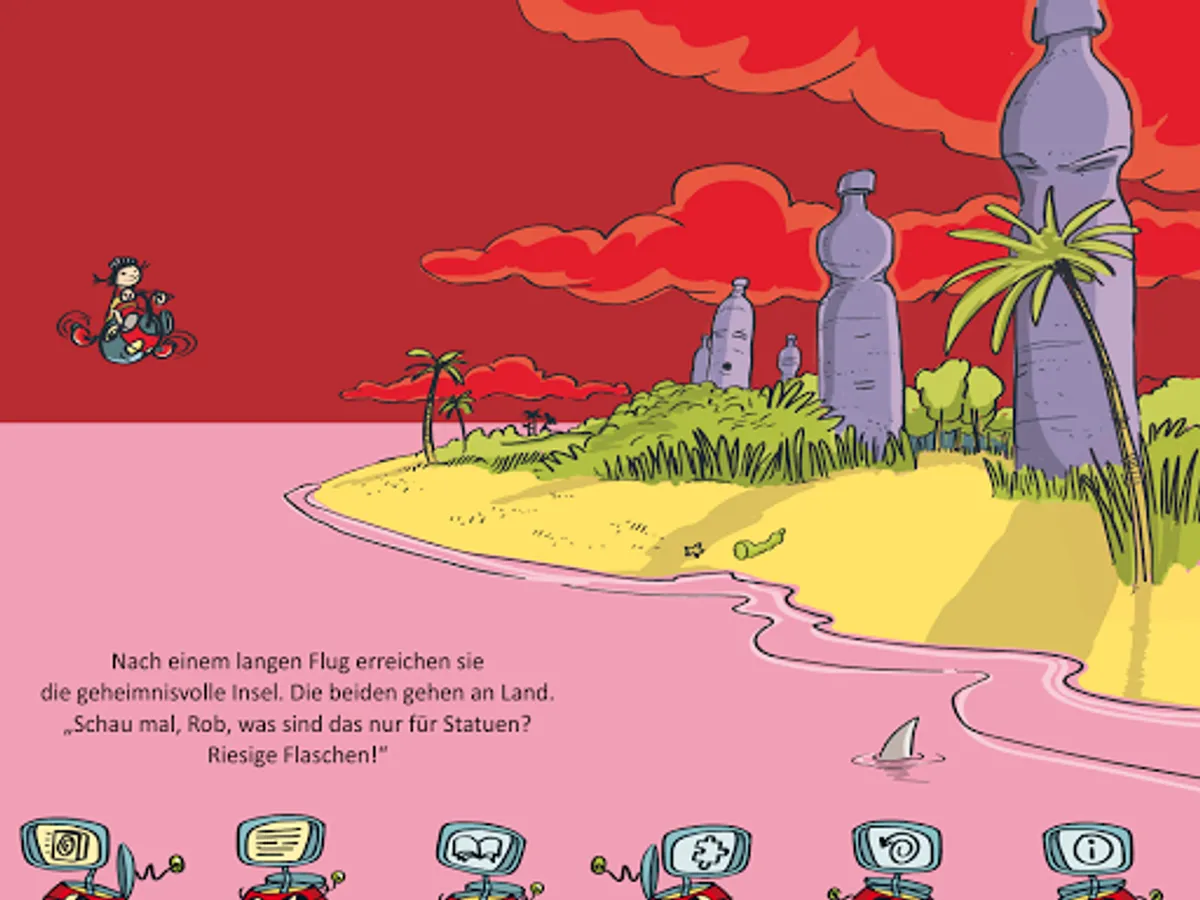 With the app you can experience the first adventure of Sara & Rob "On the Island of the Bottles". Not only can you browse through this interactive book, you can also discover many things yourself. Some of the objects you see on each page can be brought to life by tapping them. Take a close look at all the pages. On some pages, you can collect PET bottles by briefly tapping them with your finger. How many bottles you have found you can see in the scrapbook. If you like, you can not only read the book, but also play a puzzle and solve a puzzle.