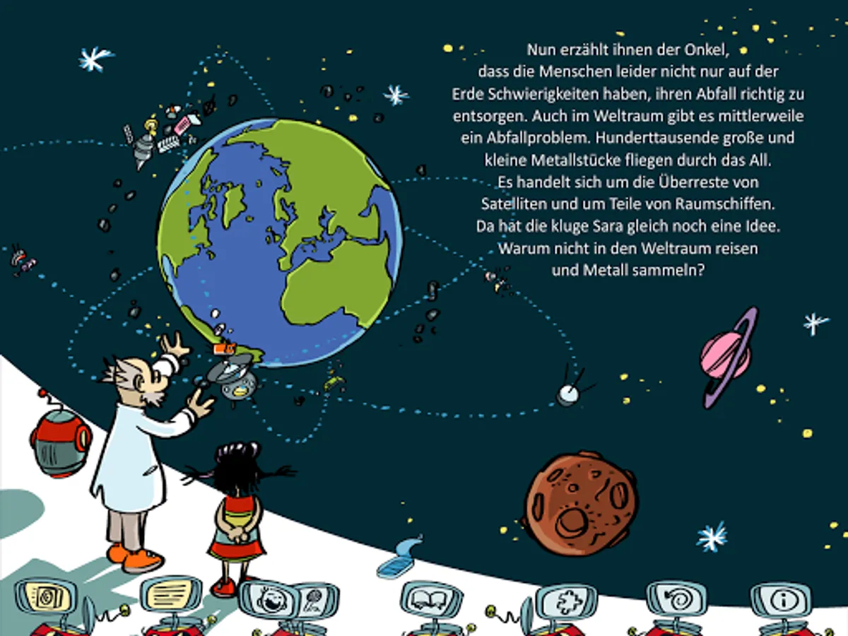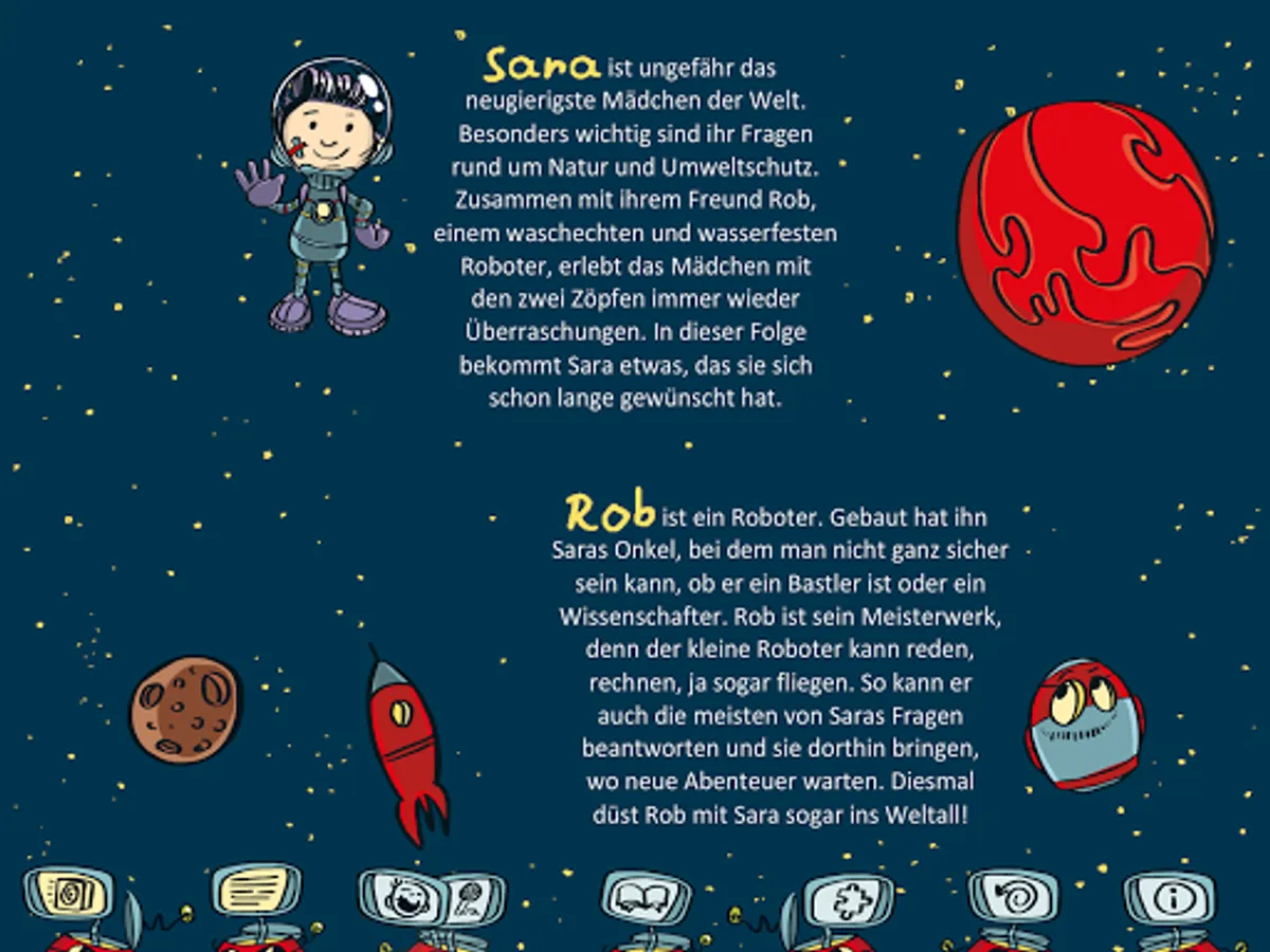 Rob is a robot. It was built by Sara's uncle, and you can not be sure if he's a hobbyist or a scientist. Rob is his masterpiece, because the little robot can talk, calculate, even fly. So he can also answer most of Sara's questions and take them to where new adventures await. This time, Rob even storms into space with Sara!