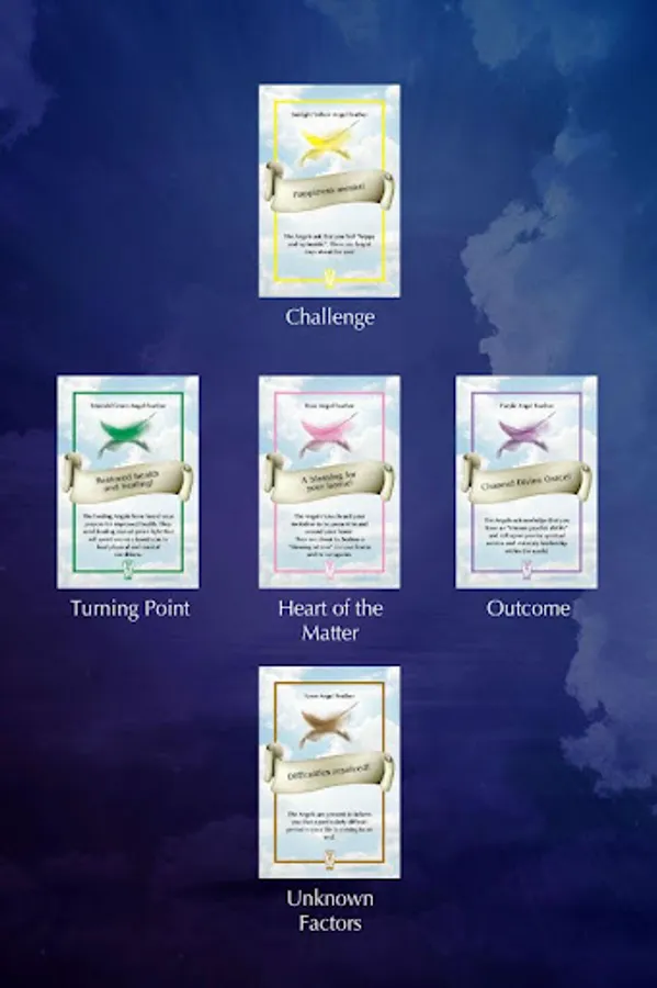 This deck comprises a beautiful combination of 'Colour Energy' and 'Angelic Guidance'. The app assists you with performing and interpreting your Angel Feather readings.