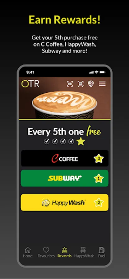 Buy via the OTR App or scan your OTR App barcode instore to get your 5th item FREE on a wide range of products including C Coffee, HappyWash and more.
