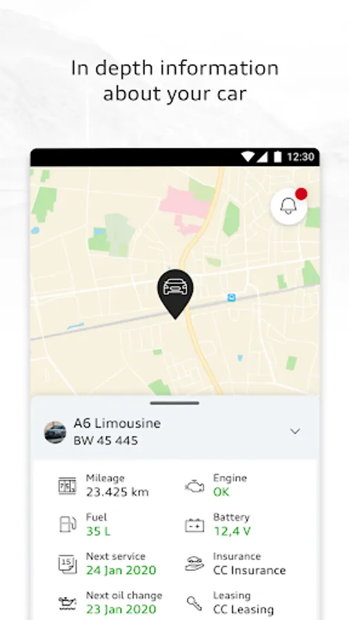 mitAudi provides an overview of vital parts on your car, so you do not need to worry about technical aspects but can enjoy life on the road and rest assured that mitAudi will keep you updated in case that any problem with your car should occur.