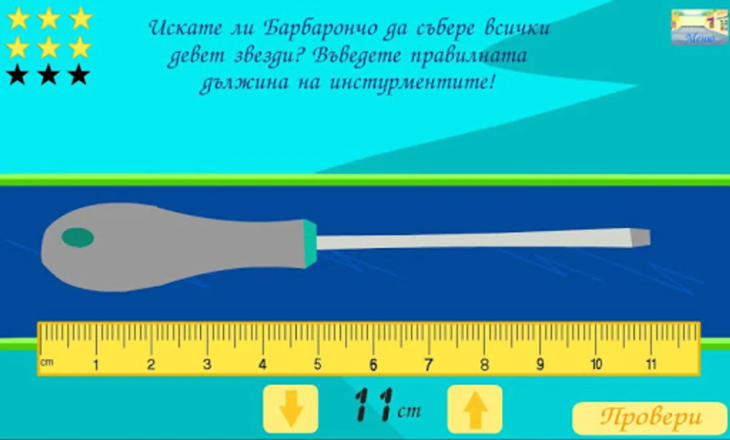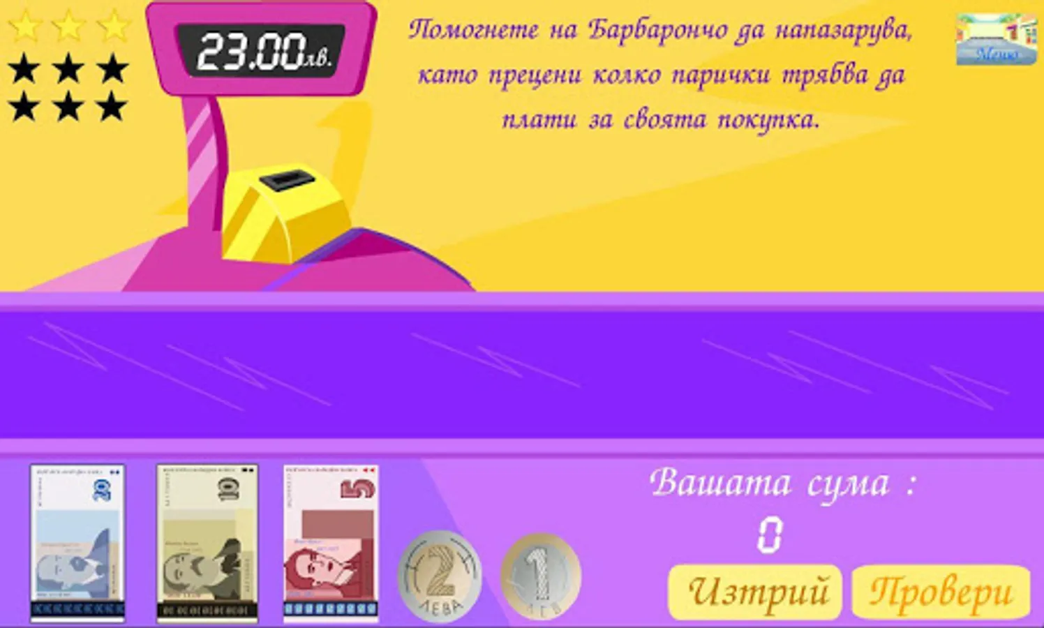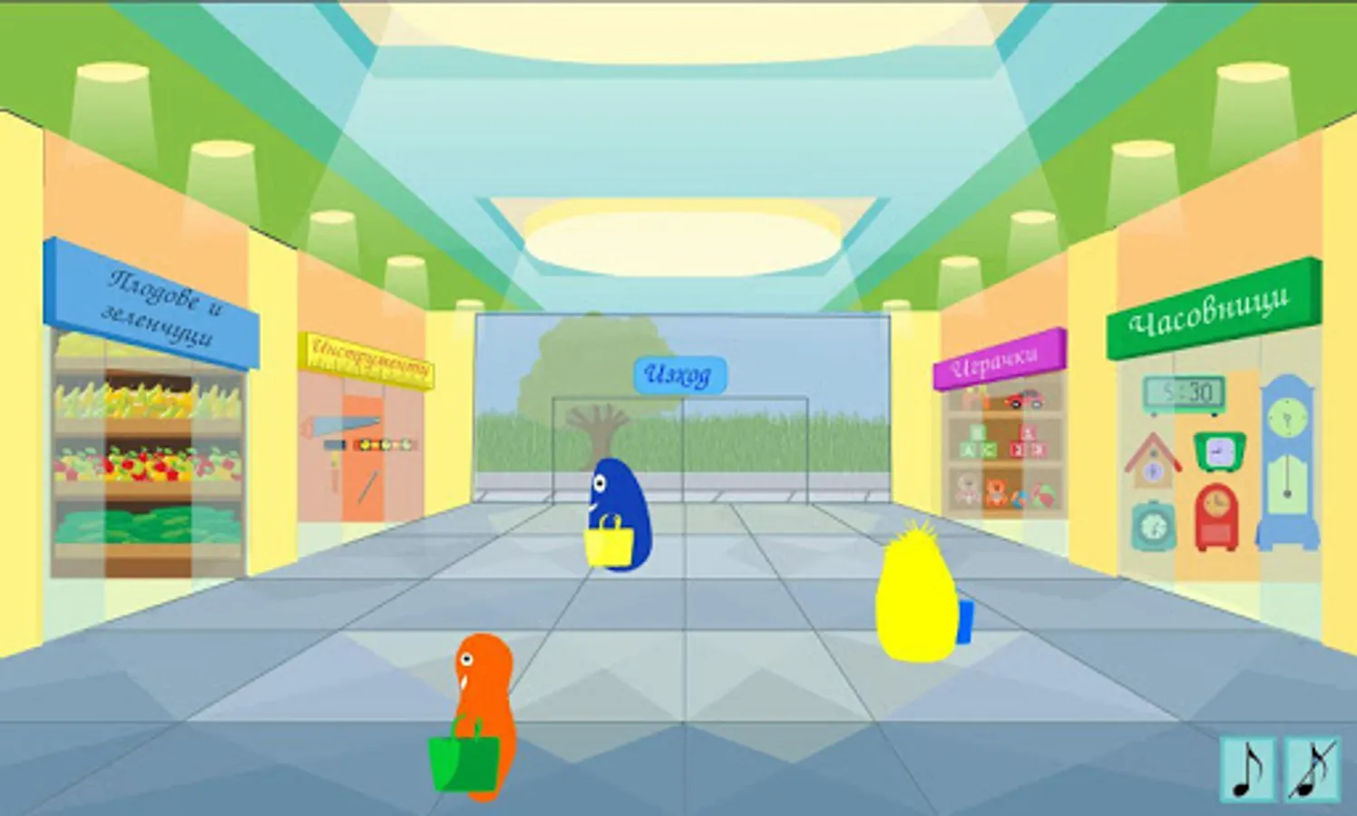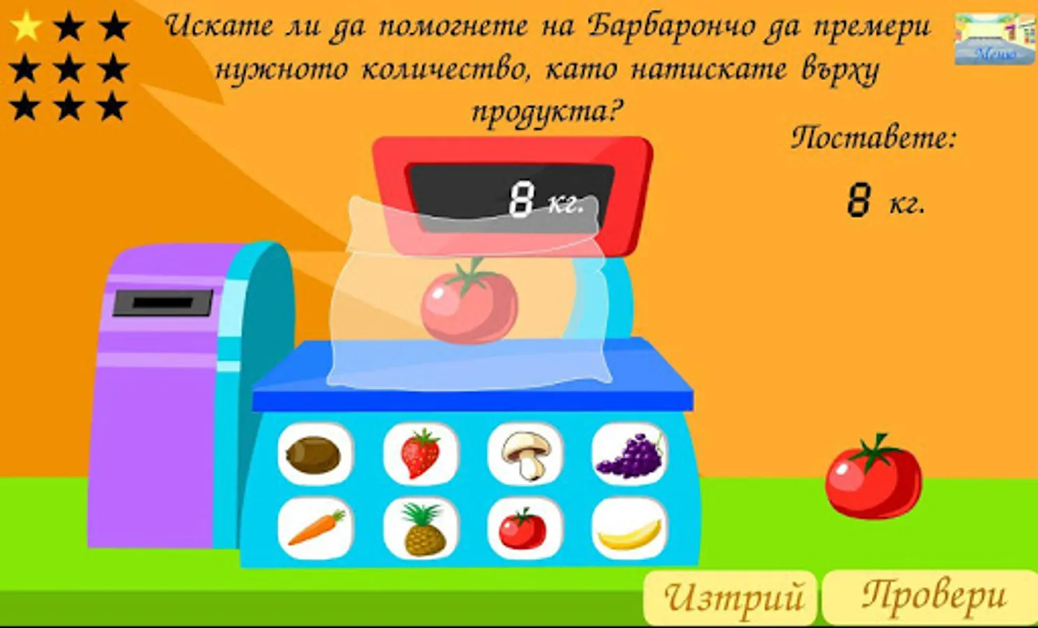 The units are presented in the form of shops: In the Fruit and Vegetables store, consumers are introduced to the weight kilogram unit. In the "Tools" store, measuring different tools, the user acquaints himself with the "centimeter" length unit. In Toys Store, the user sees the money. And in the last store he learns to know the clock.