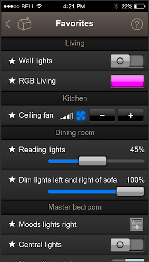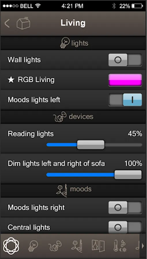 • Moods: create the right mood with predefined audio, light and temperature settings