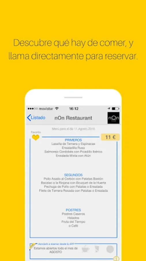 With TuMenúEn you will be able to know the updated menu of the day offered by the restaurants in your neighborhood, reserve a table and access exclusive promotions and discounts.