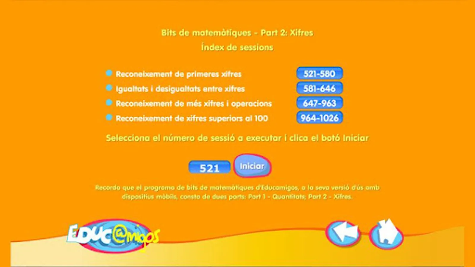 Aquest app amb les sessions bit Educamigos xifres of 501 sessions d'pacing told that facilitate els nens reconeguin, d'i ordered a linear way, you xifres them from 0 to 100 i operacions aritmètiques them being pruned realitzar between elles: sumes, subtract, i multiplicacions divisions.