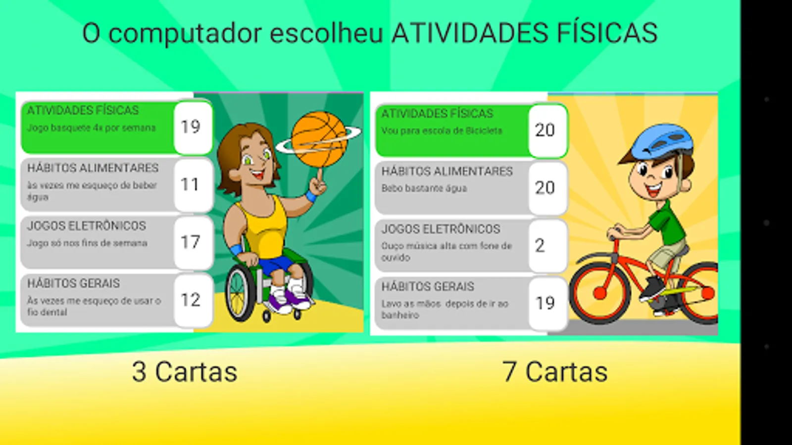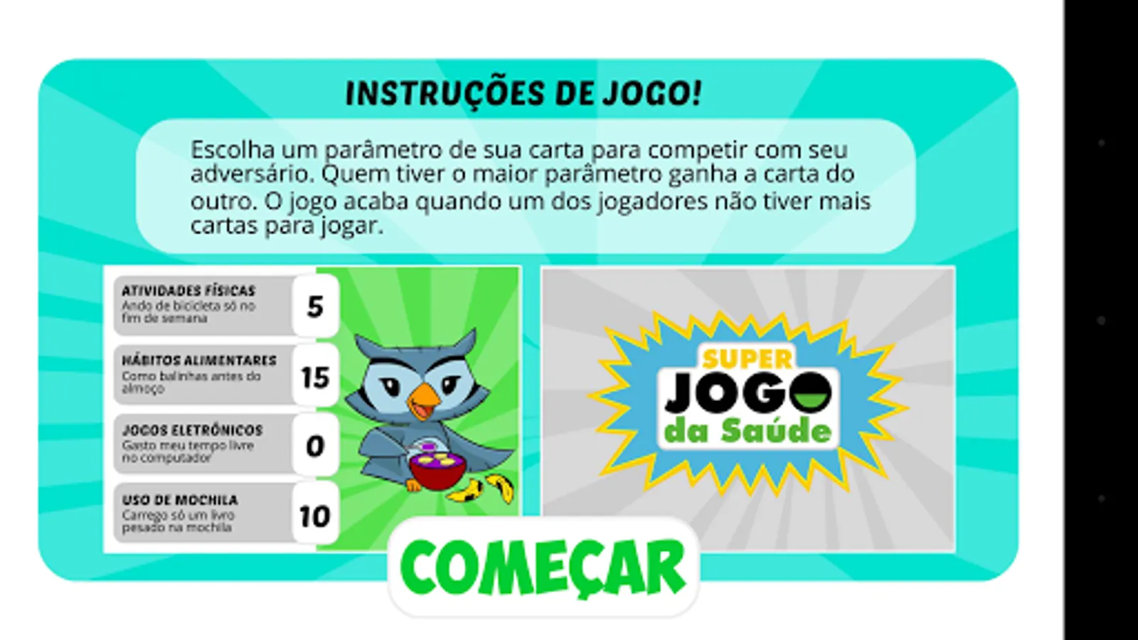 Super Game of Health is a card game between two players compare their healthy habits and score points according to their attributes. Similar to the classic Super Trump, challenge your opponent by choosing one of the attributes of his letter to overcome rival - the smartphone:
