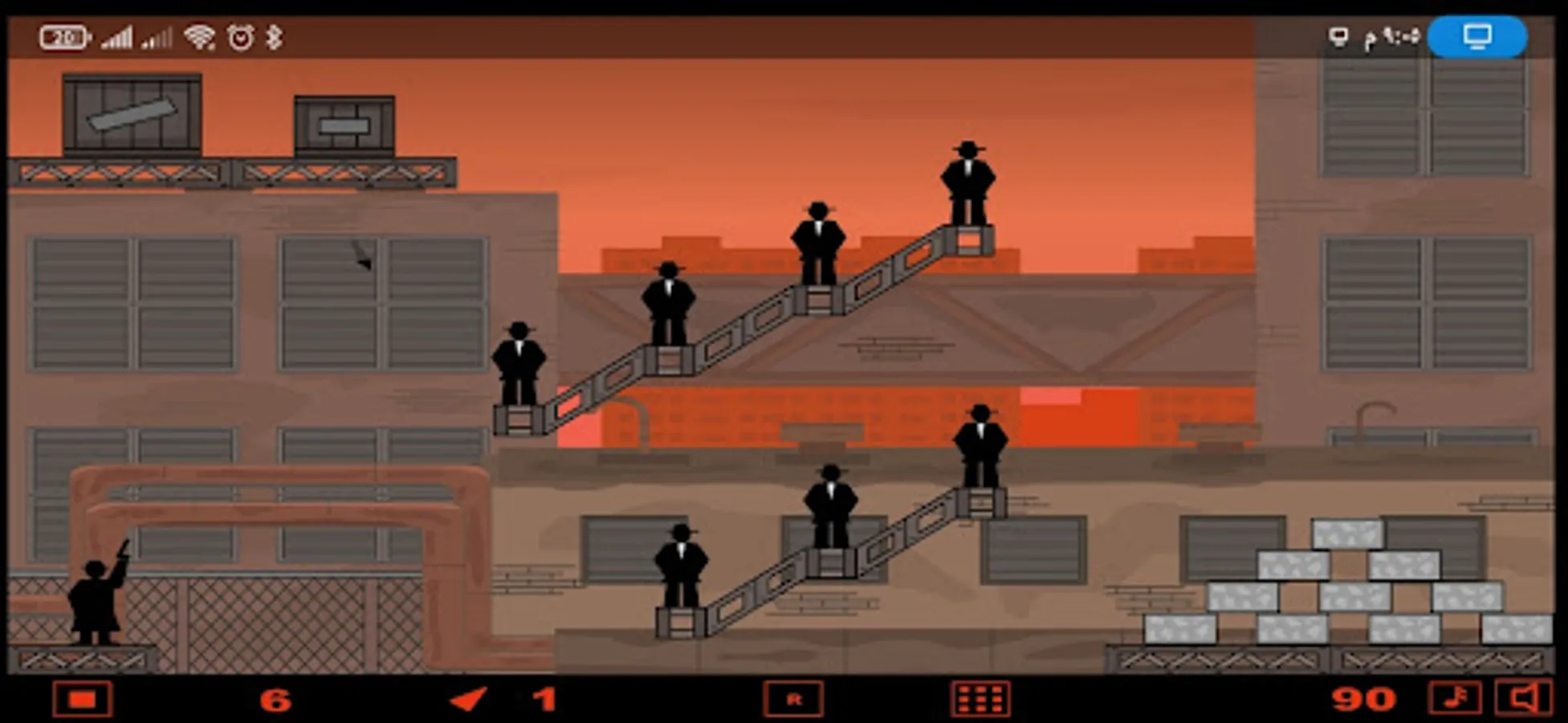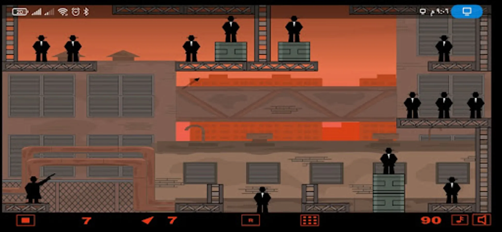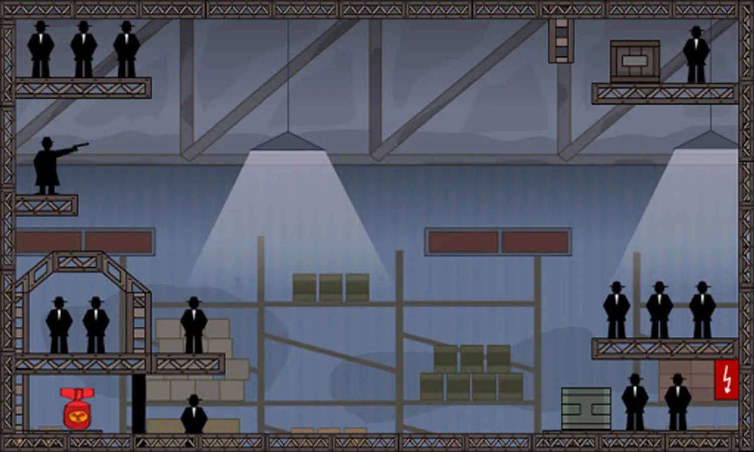 In each level, your goal is to kill all the men who are wearing suits with the limited number of bullets given to them. These bullets will rest on walls, ceilings and floors, allowing you to kill many men with one shot. You can also kill men by shooting objects, such as boxes and explosive barrels.