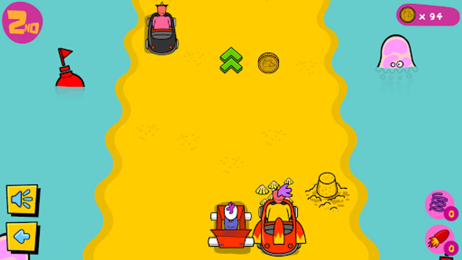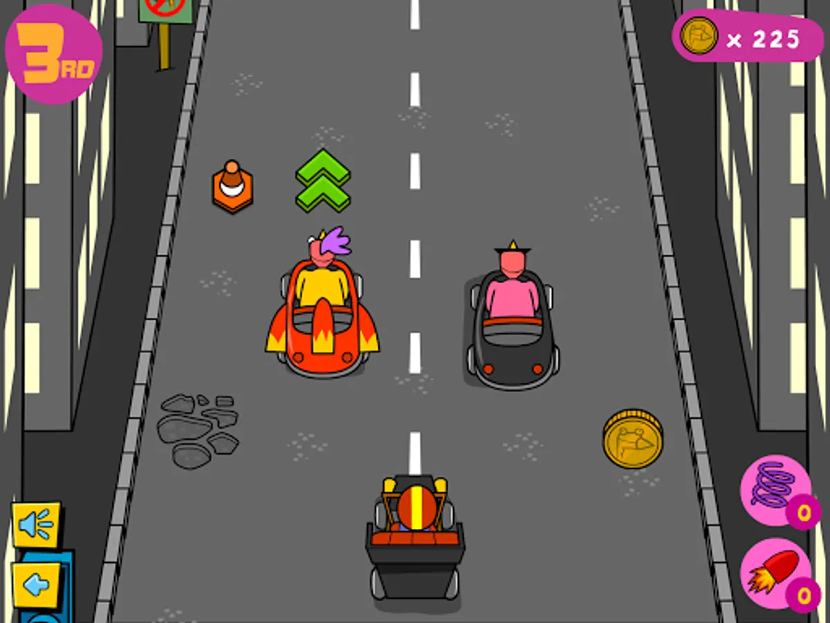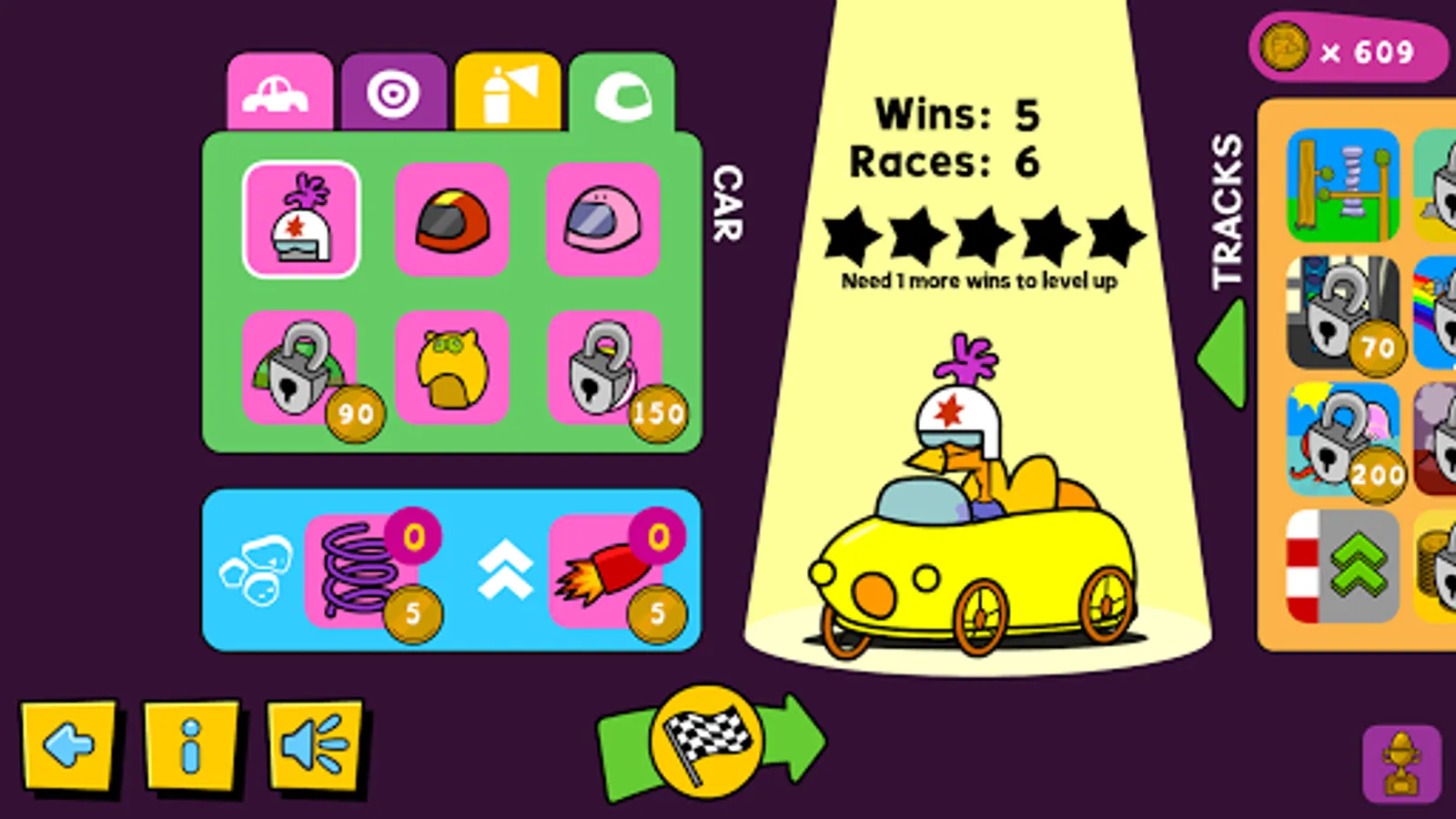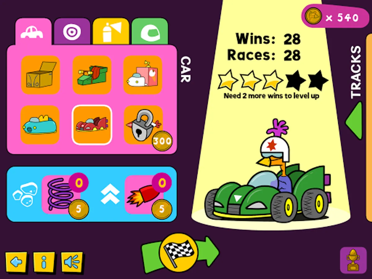 Busy Things' most popular game is now available as an app! Help the chicken build the fastest car and race your way to victory on 11 colourful tracks! Tap the edges of the screen to move side to side and try to avoid obstacles while collecting coins and boost pads. The app version comes with many additional features! With 4 possible race speeds and dozens of car combinations, this game will provide hours of racing fun for your child. The difficulty changes based on how well you play, making it appropriate for younger and older children alike.