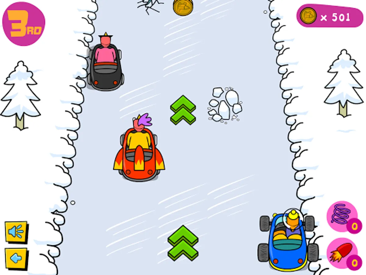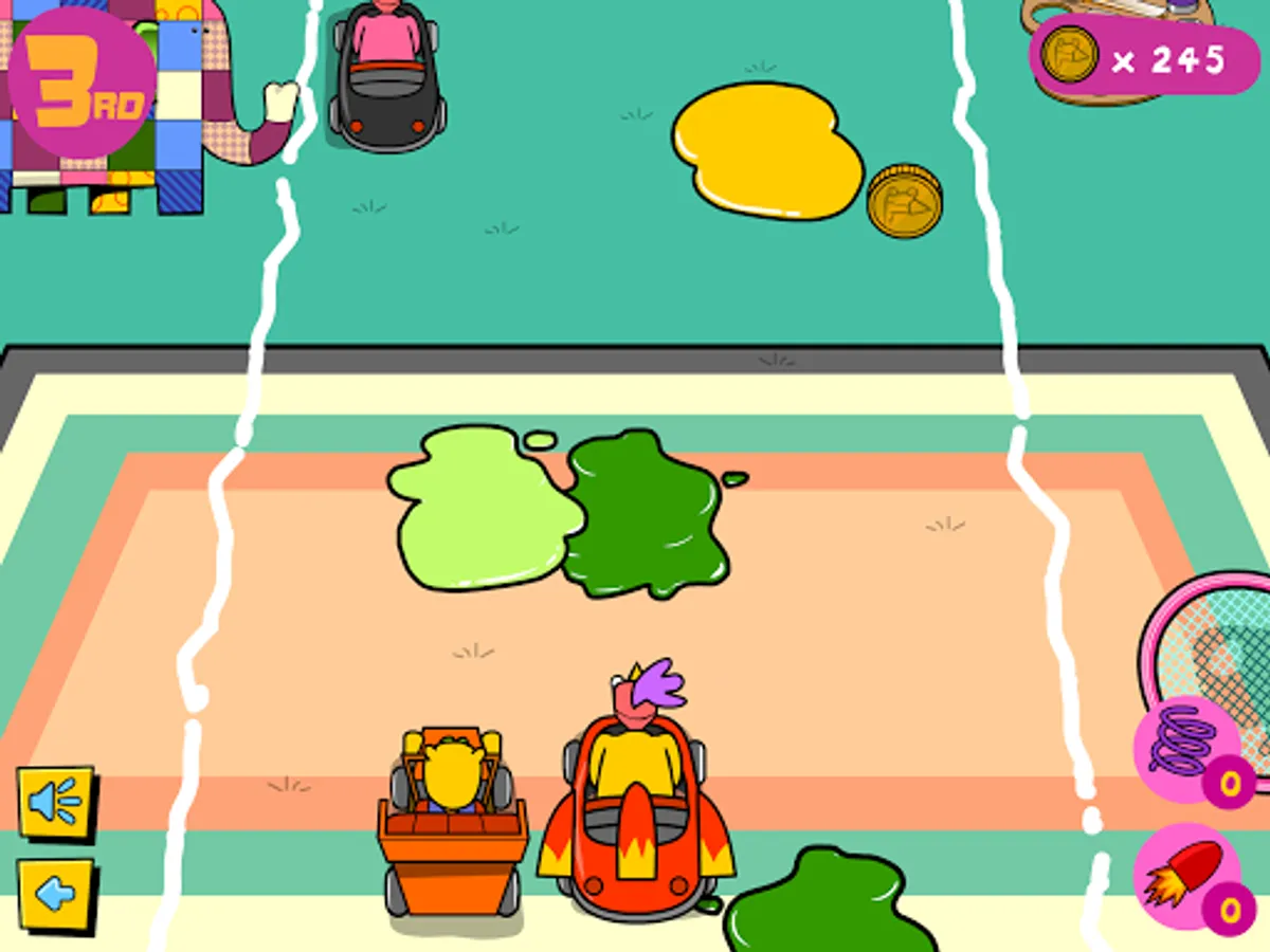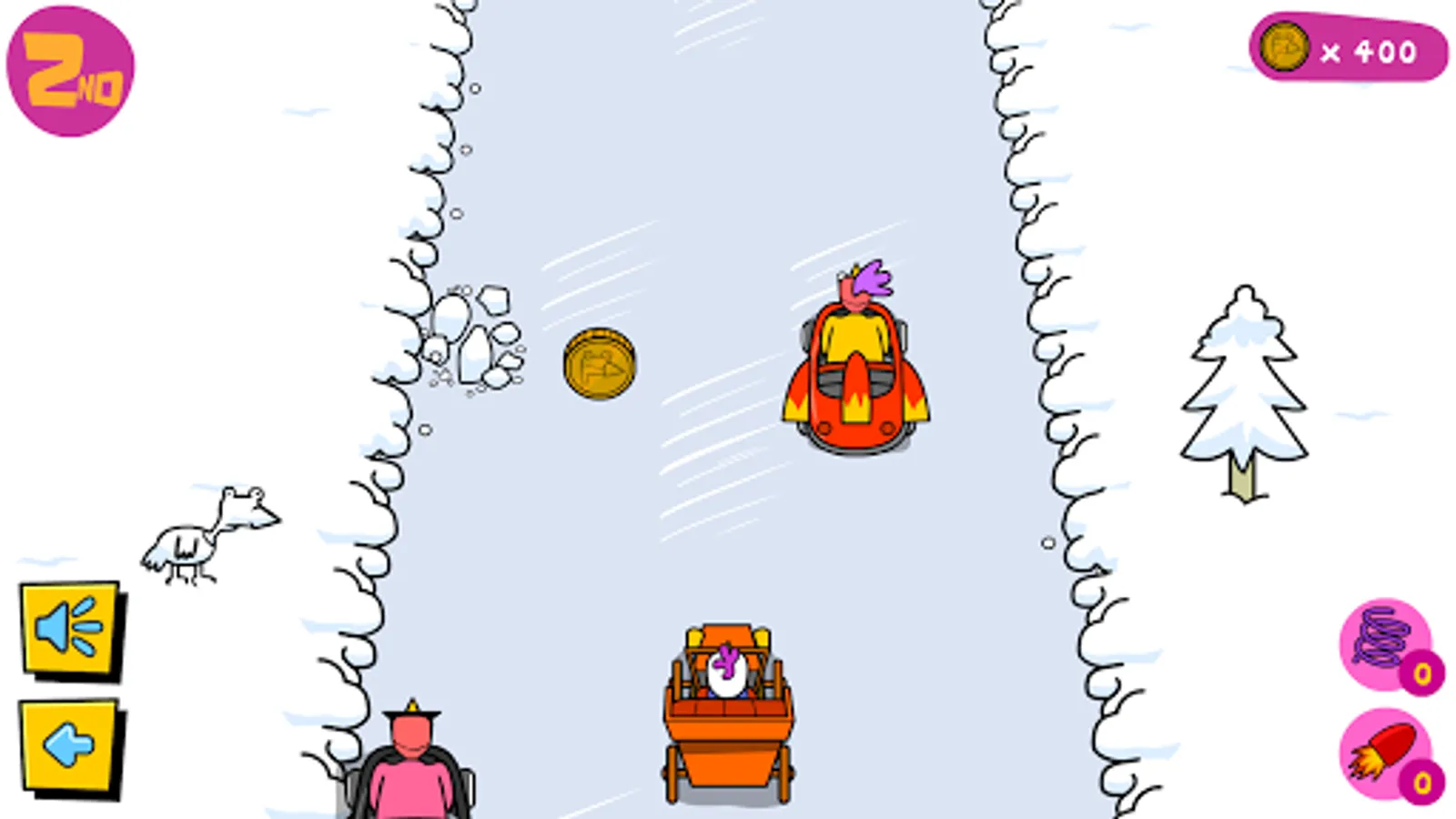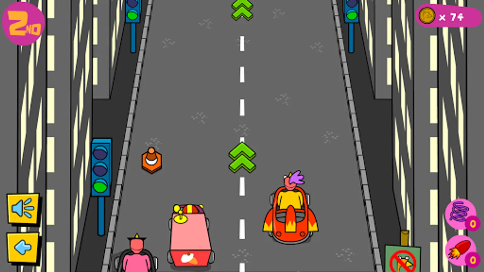 Busy Things' most popular game is now available as an app! Help the chicken build the fastest car and race your way to victory on 11 colourful tracks! Tap the edges of the screen to move side to side and try to avoid obstacles while collecting coins and boost pads. The app version comes with many additional features! With 4 possible race speeds and dozens of car combinations, this game will provide hours of racing fun for your child. The difficulty changes based on how well you play, making it appropriate for younger and older children alike.