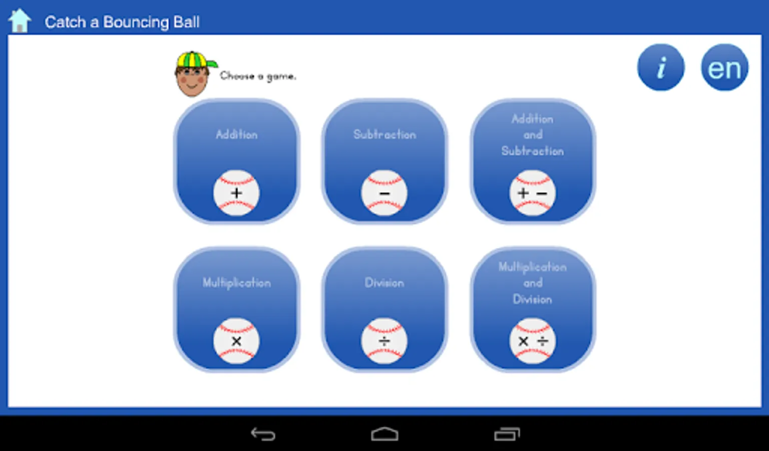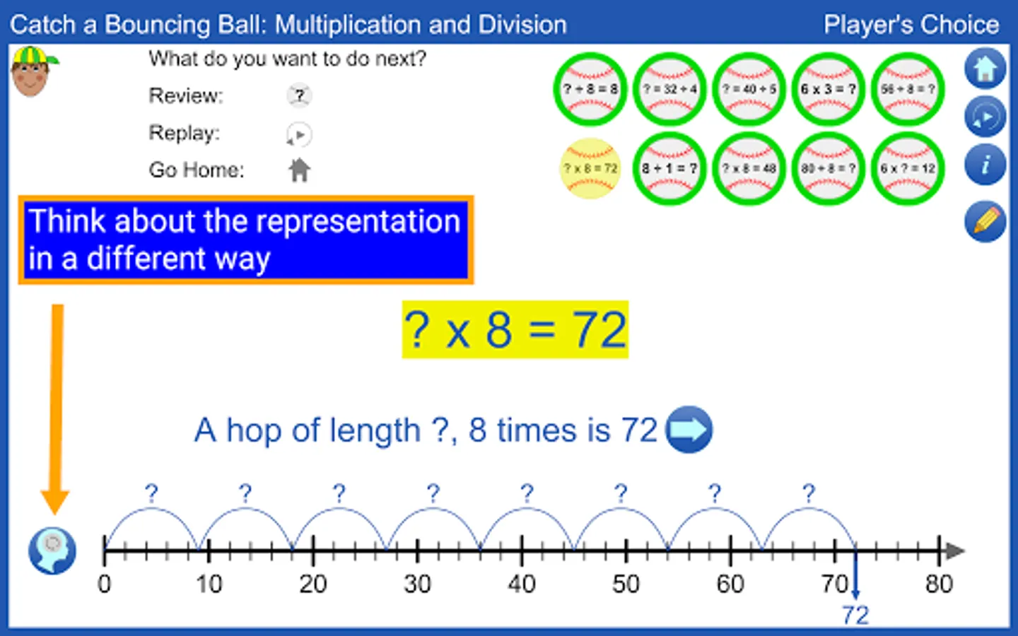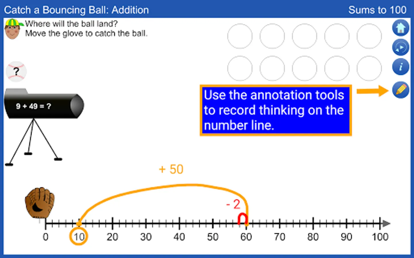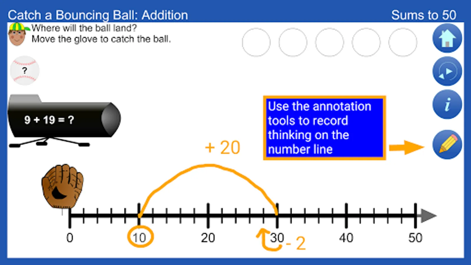 Catch a Bouncing Ball Operations by mathies is a game that provides opportunities to practise the fundamental skills of addition, subtraction, multiplication or division. For single operation games the unknown value is the result (e.g., 3 + 5 = ?). For mixed operation games the position of the unknown value changes (e.g., 3 + ? = 8). The player determines the unknown value and drags the glove to the correct answer on the number line.