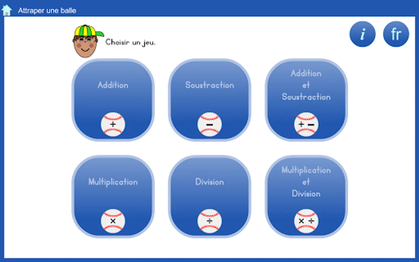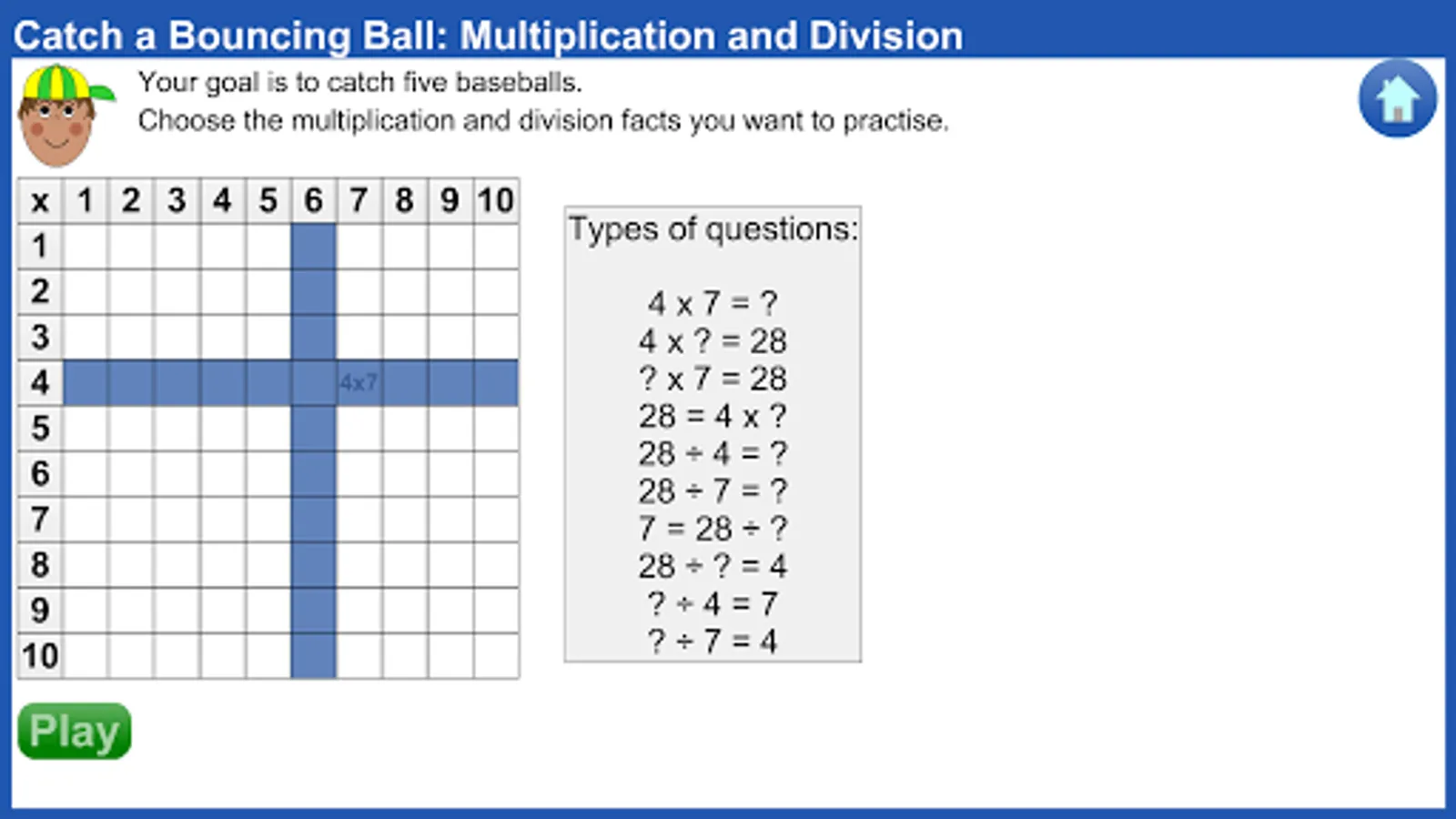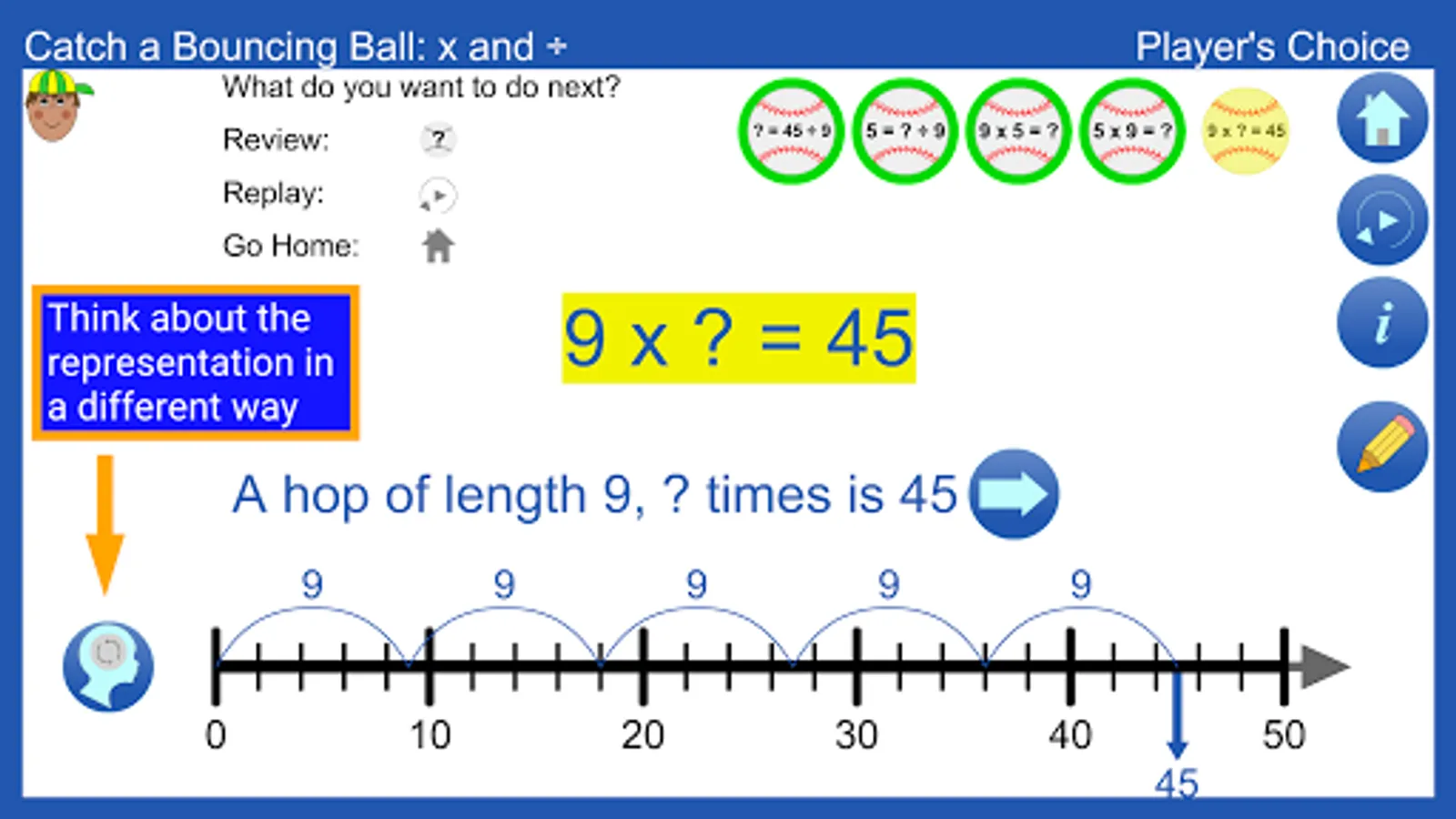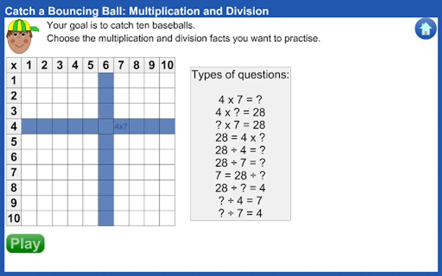 Catch a Bouncing Ball Operations by mathies is a game that provides opportunities to practise the fundamental skills of addition, subtraction, multiplication or division. For single operation games the unknown value is the result (e.g., 3 + 5 = ?). For mixed operation games the position of the unknown value changes (e.g., 3 + ? = 8). The player determines the unknown value and drags the glove to the correct answer on the number line.