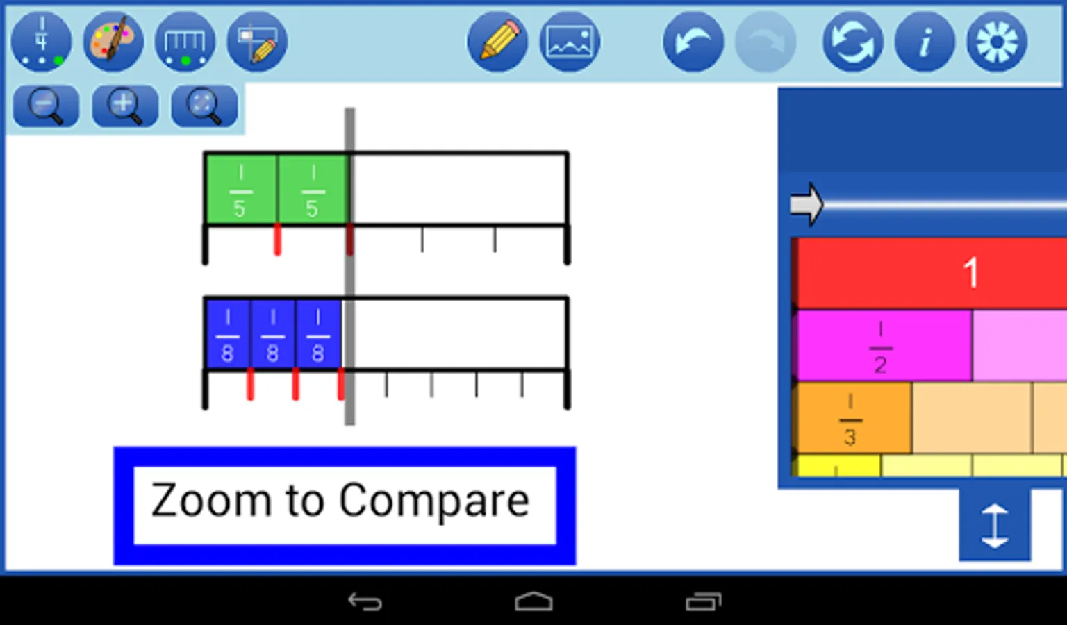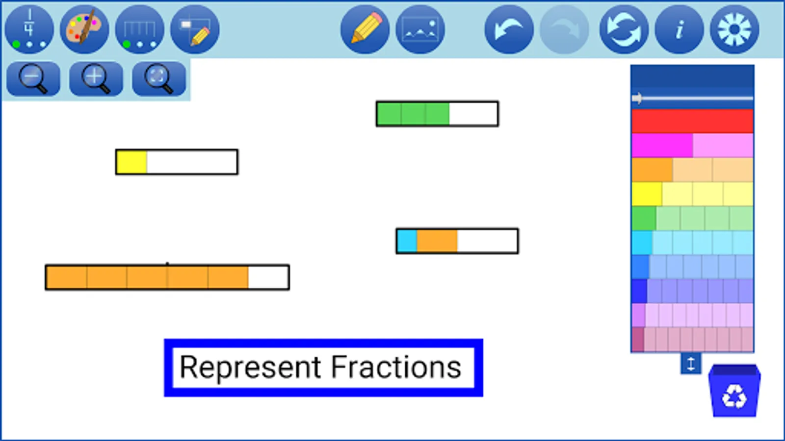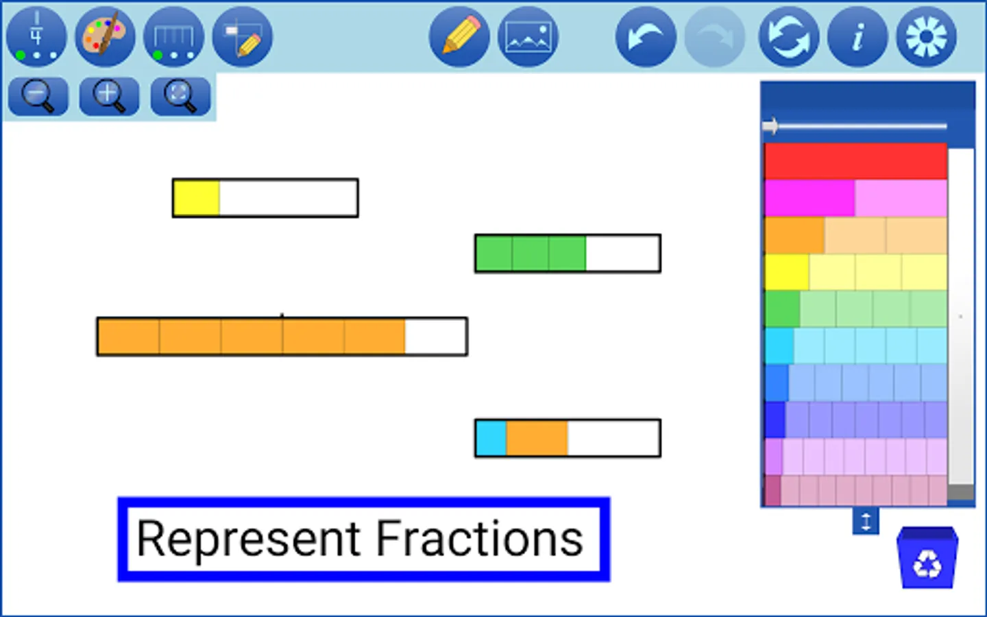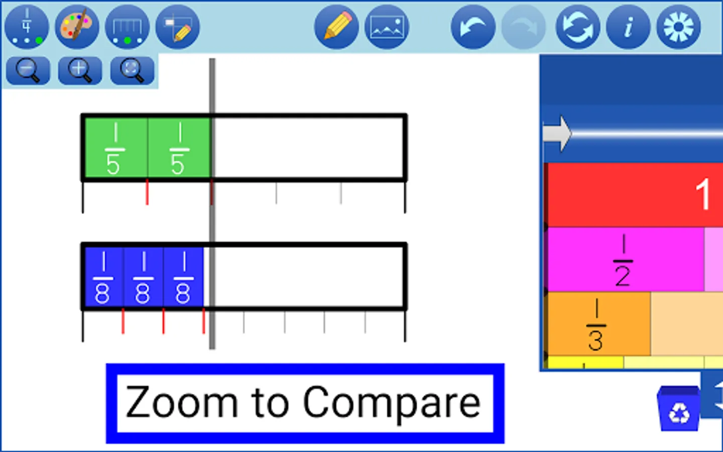 ● Zoom in on selected pieces, zoom out to see more of the workspace, zoom to fit to reorient the workspace so all fraction pieces are on the screen.