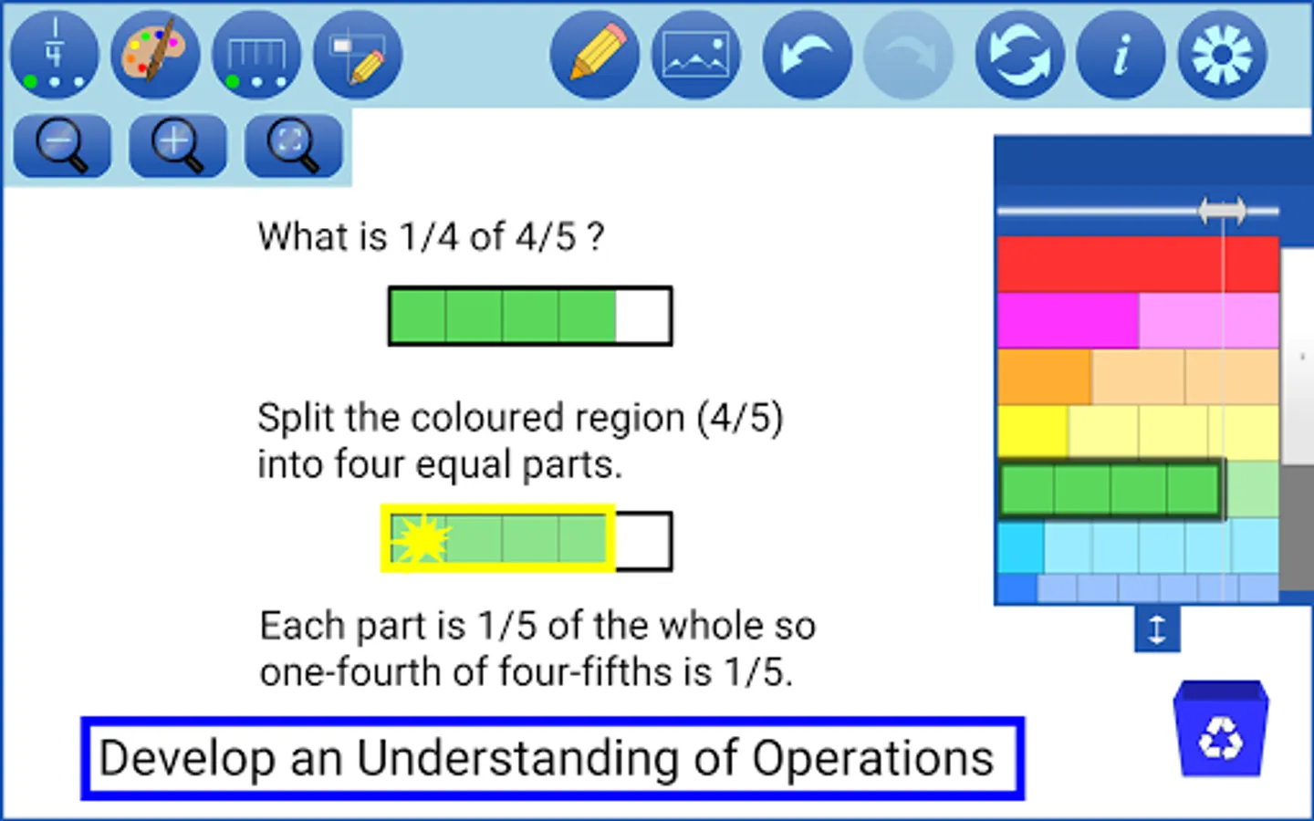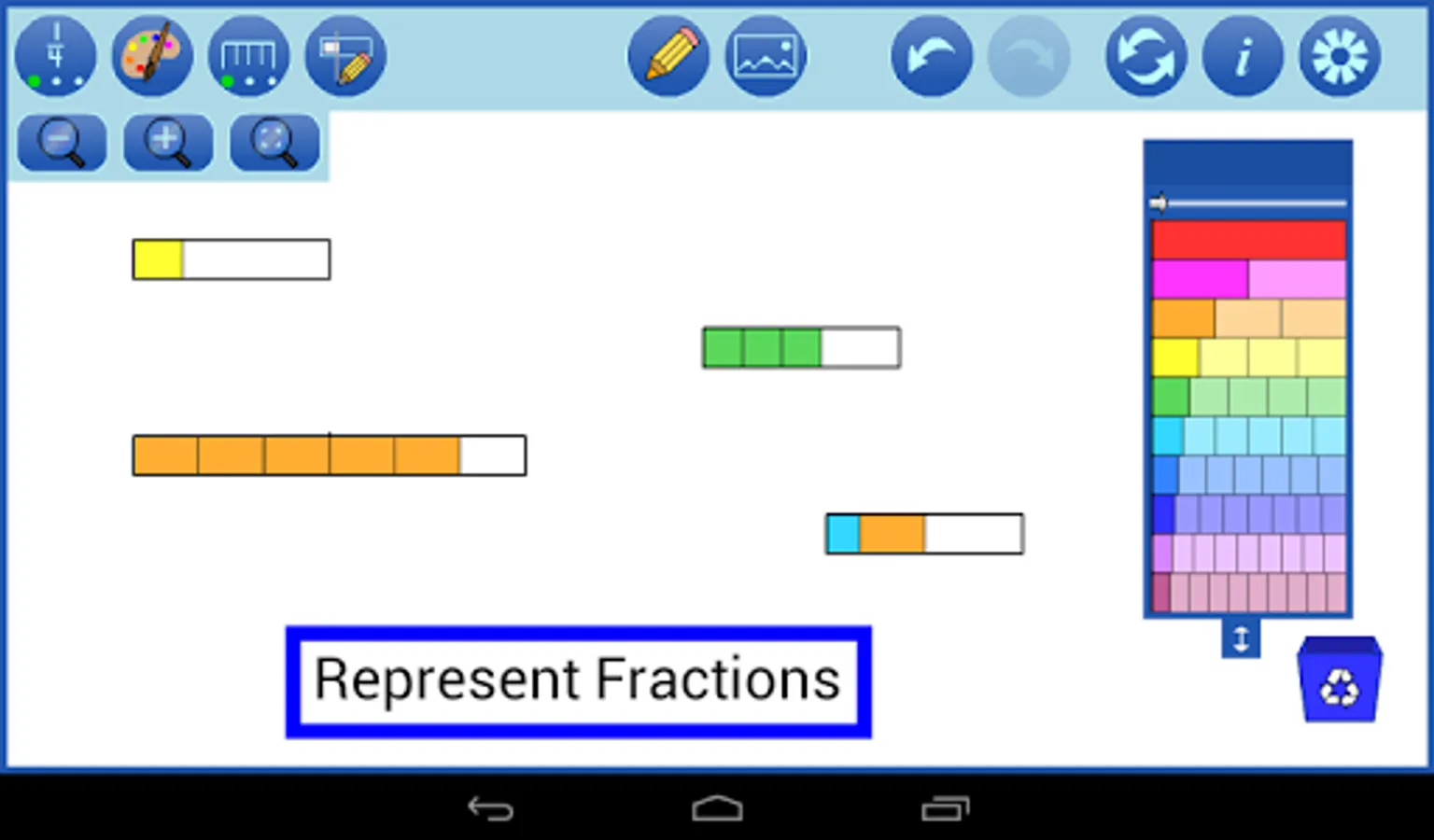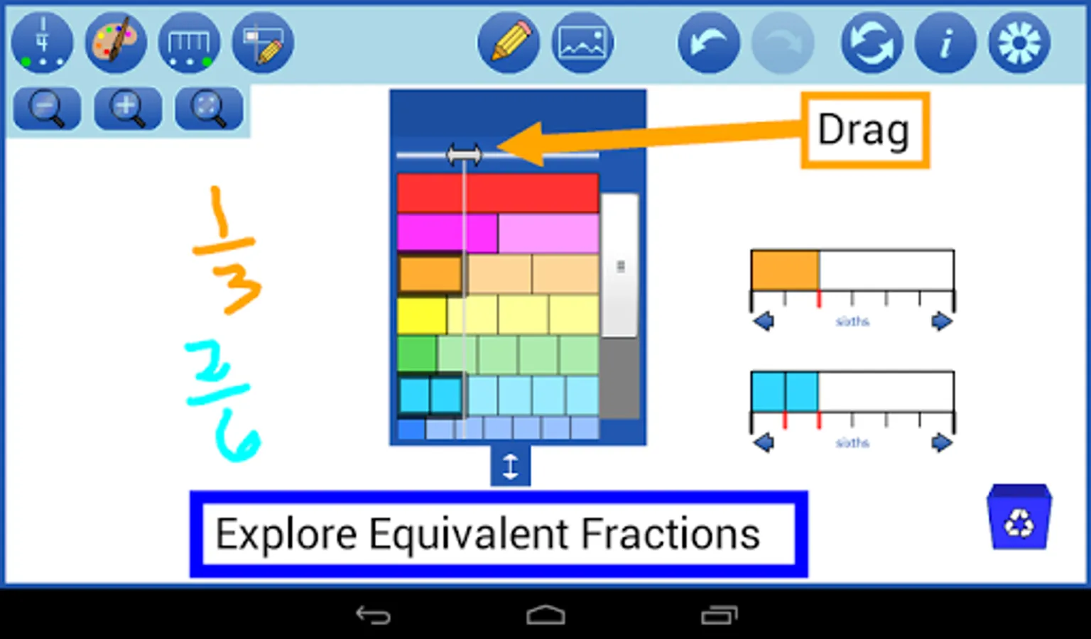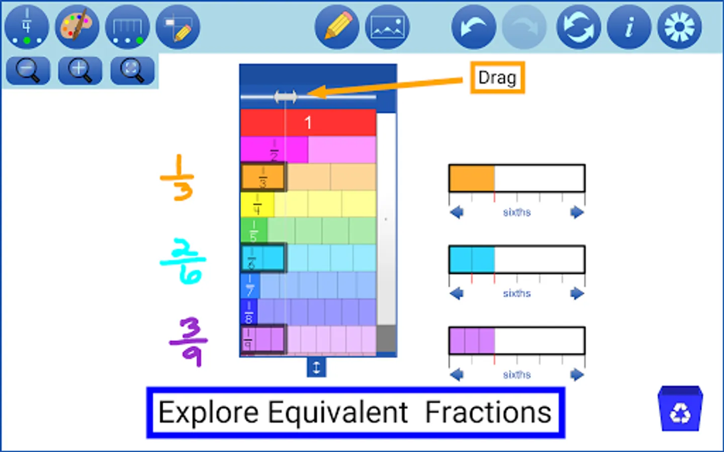 ● Zoom in on selected pieces, zoom out to see more of the workspace, zoom to fit to reorient the workspace so all fraction pieces are on the screen.