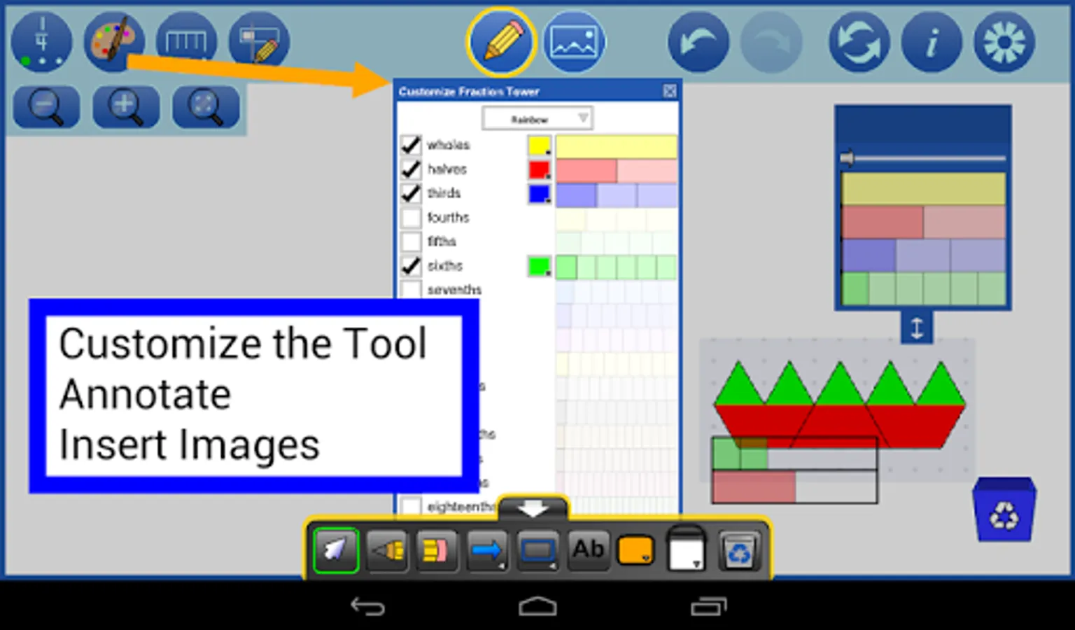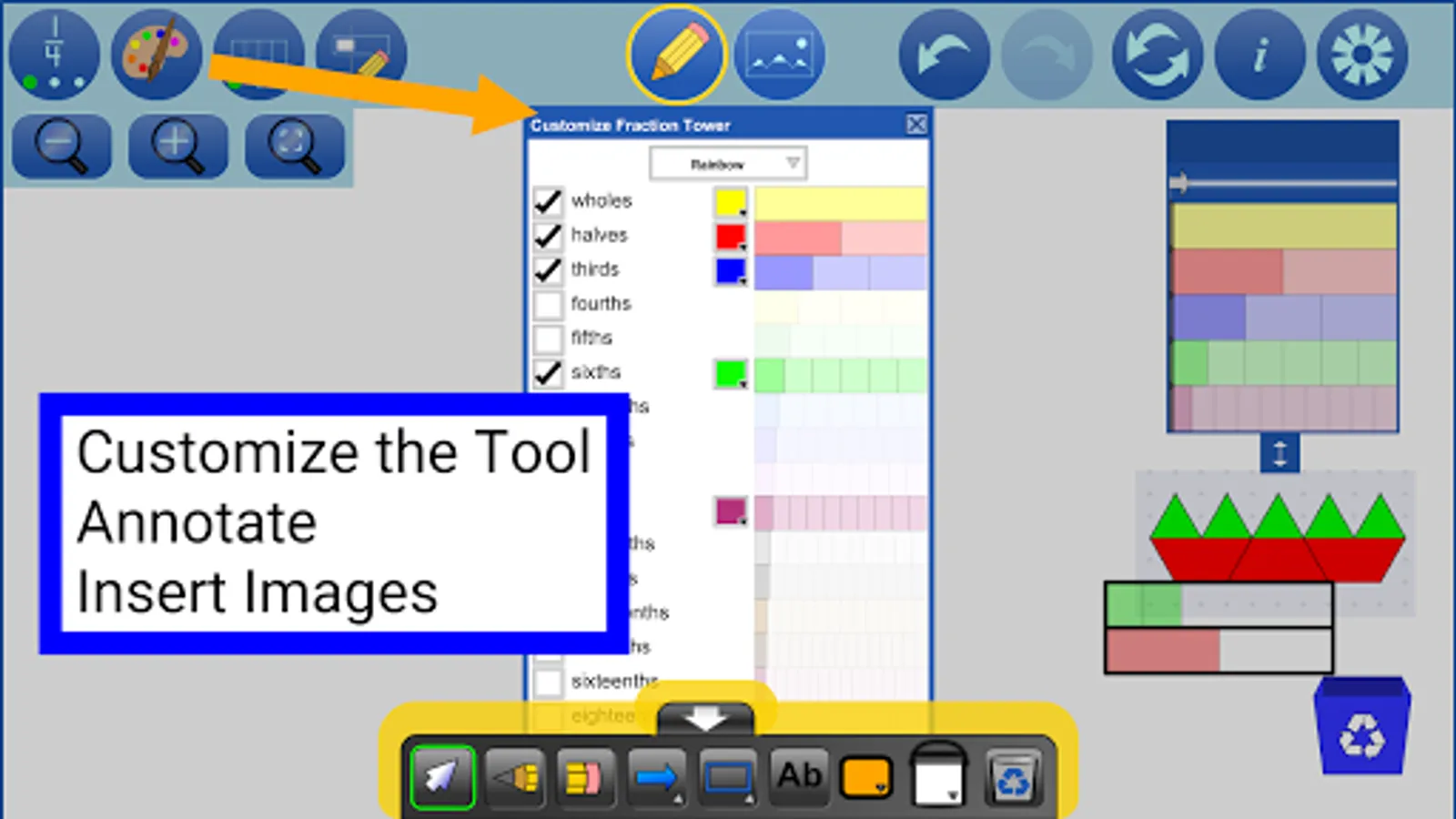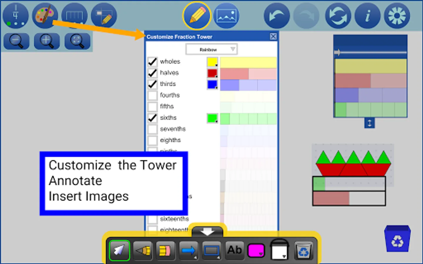● Customize the fraction tower: change the colour of pieces and which pieces are included in the tower